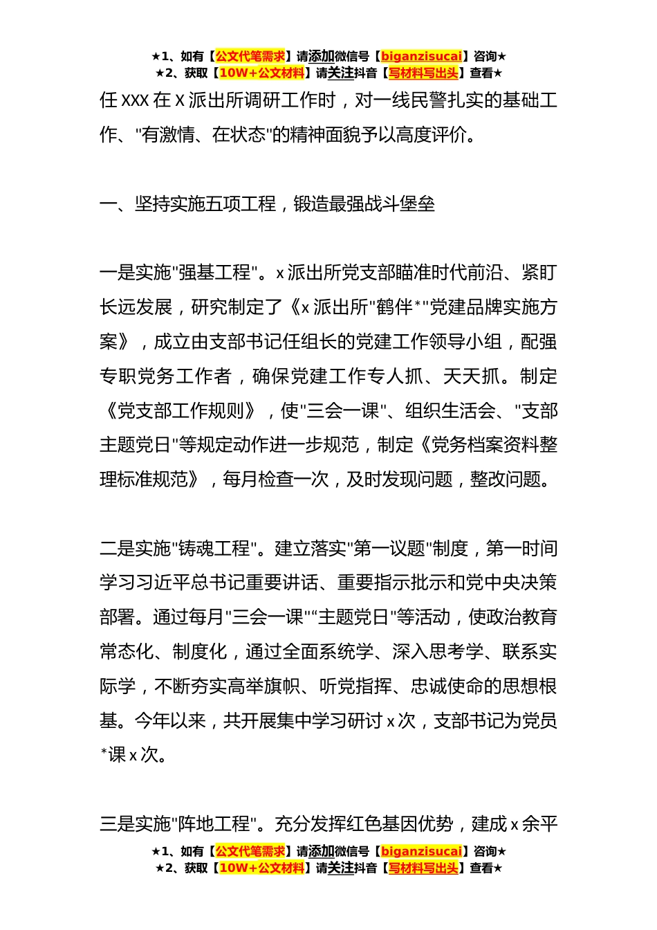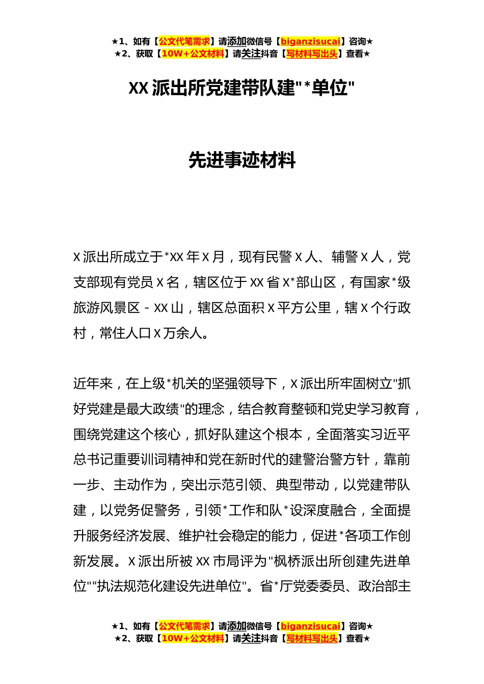 ★1、如有【公文代笔需求】请添加微信号【biganzisucai】咨询★★2、获取【10W+公文材料】请关注抖音【写材料写出头】查看★XX派出所党建带队建"*单位"先进事迹材料X派出所成立于*XX年X月,现有民警X人、辅警X人,党支部现有党员X名,辖区位于XX省X*部山区,有国家*级旅游风景区-XX山,辖区总面积X平方公里,辖X个行政村,常住人口X万余人。近年来,在上级*机关的坚强领导下,X派出所牢固树立"抓好党建是最大政绩"的理念,结合教育整顿和党史学习教育,围绕党建这个核心,抓好队建这个根本,全面落实习近平总书记重要训词精神和党在新时代的建警治警方针,靠前一步、主动作为,突出示范引领、典型带动,以党建带队建,以党务促警务,引领*工作和队*设深度融合,全面提升服务经济发展、维护社会稳定的能力,促进*...