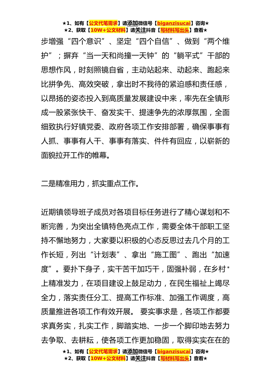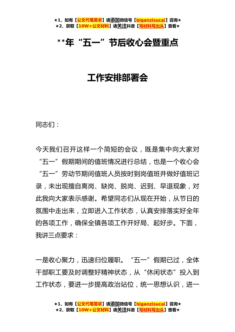 ★1、如有【公文代笔需求】请添加微信号【biganzisucai】咨询★★2、获取【10W+公文材料】请关注抖音【写材料写出头】查看★**年“五一”节后收心会暨重点工作安排部署会同志们:今天我们召开这样一个简短的会议,既是集中向大家对“五一”假期期间的值班情况进行总结,也是一个收心会“五一”劳动节期间值班人员按时到岗值班并做好值班记录,未出现擅自离岗、缺岗、脱岗、迟到、早退现象,对此我向大家表示感谢。希望同志们从现在开始,从节日的氛围中走出来,立即进入工作状态,认真安排落实好全年的各项工作,确保全镇各项工作开好局、起好步。下面,我讲三点要求:一是收心聚力,迅速归位履职。“五一”假期已过,全体干部职工要及时调整好精神状态,从“休闲状态”投入到工作状态,要进一步提高政治站位,统...