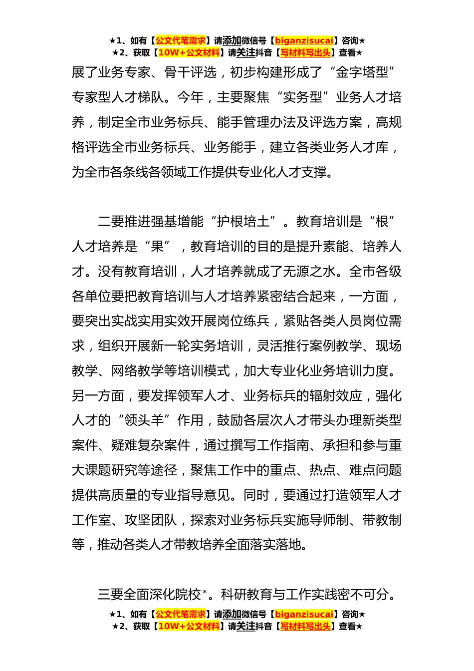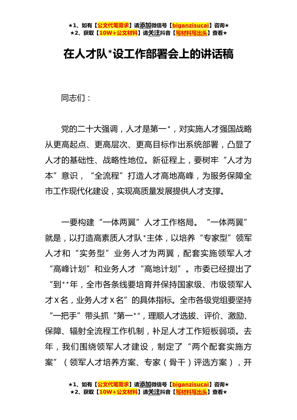 ★1、如有【公文代笔需求】请添加微信号【biganzisucai】咨询★★2、获取【10W+公文材料】请关注抖音【写材料写出头】查看★在人才队*设工作部署会上的讲话稿同志们:党的二十大强调,人才是第一*,对实施人才强国战略从更高起点、更高层次、更高目标作出系统部署,凸显了人才的基础性、战略性地位。新征程上,要树牢“人才为本”意识,“全流程”打造人才高地高峰,为服务保障全市工作现代化建设,实现高质量发展提供人才支撑。一要构建“一体两翼”人才工作格局。“一体两翼”就是,以打造高素质人才队*主体,以培养“专家型”领军人才和“实务型”业务人才为两翼,配套实施领军人才“高峰计划”和业务人才“高地计划”。市委已经提出了“到**年,全市各条线要培育并保持国家级、市级领军人才X名,业务人才X名”...