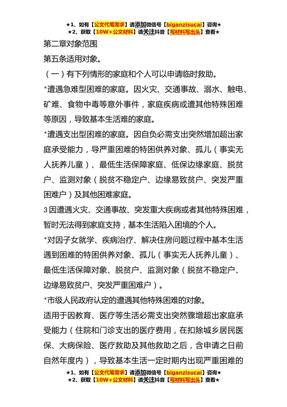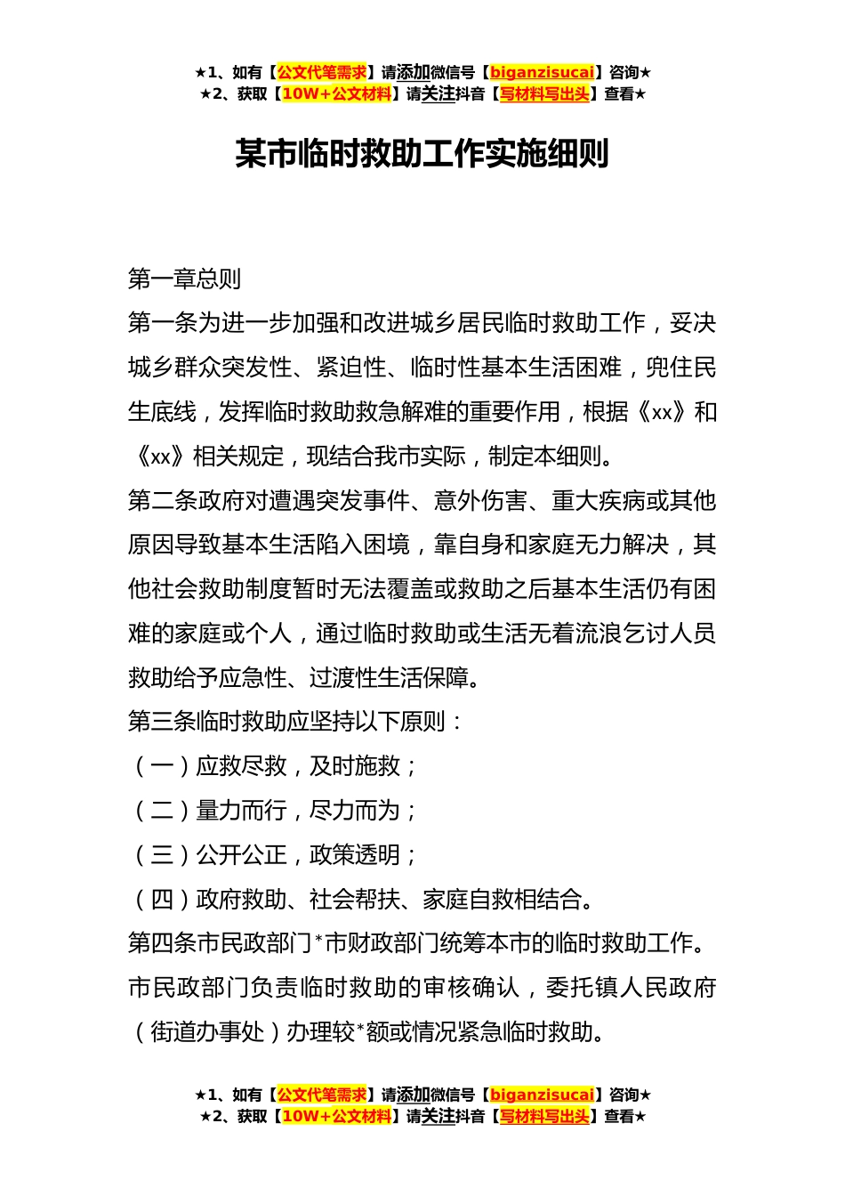 ★1、如有【公文代笔需求】请添加微信号【biganzisucai】咨询★★2、获取【10W+公文材料】请关注抖音【写材料写出头】查看★某市临时救助工作实施细则第一章总则第一条为进一步加强和改进城乡居民临时救助工作,妥决城乡群众突发性、紧迫性、临时性基本生活困难,兜住民生底线,发挥临时救助救急解难的重要作用,根据《xx》和《xx》相关规定,现结合我市实际,制定本细则。第二条政府对遭遇突发事件、意外伤害、重大疾病或其他原因导致基本生活陷入困境,靠自身和家庭无力解决,其他社会救助制度暂时无法覆盖或救助之后基本生活仍有困难的家庭或个人,通过临时救助或生活无着流浪乞讨人员救助给予应急性、过渡性生活保障。第三条临时救助应坚持以下原则:(一)应救尽救,及时施救;(二)量力而行,尽力而为;(...
