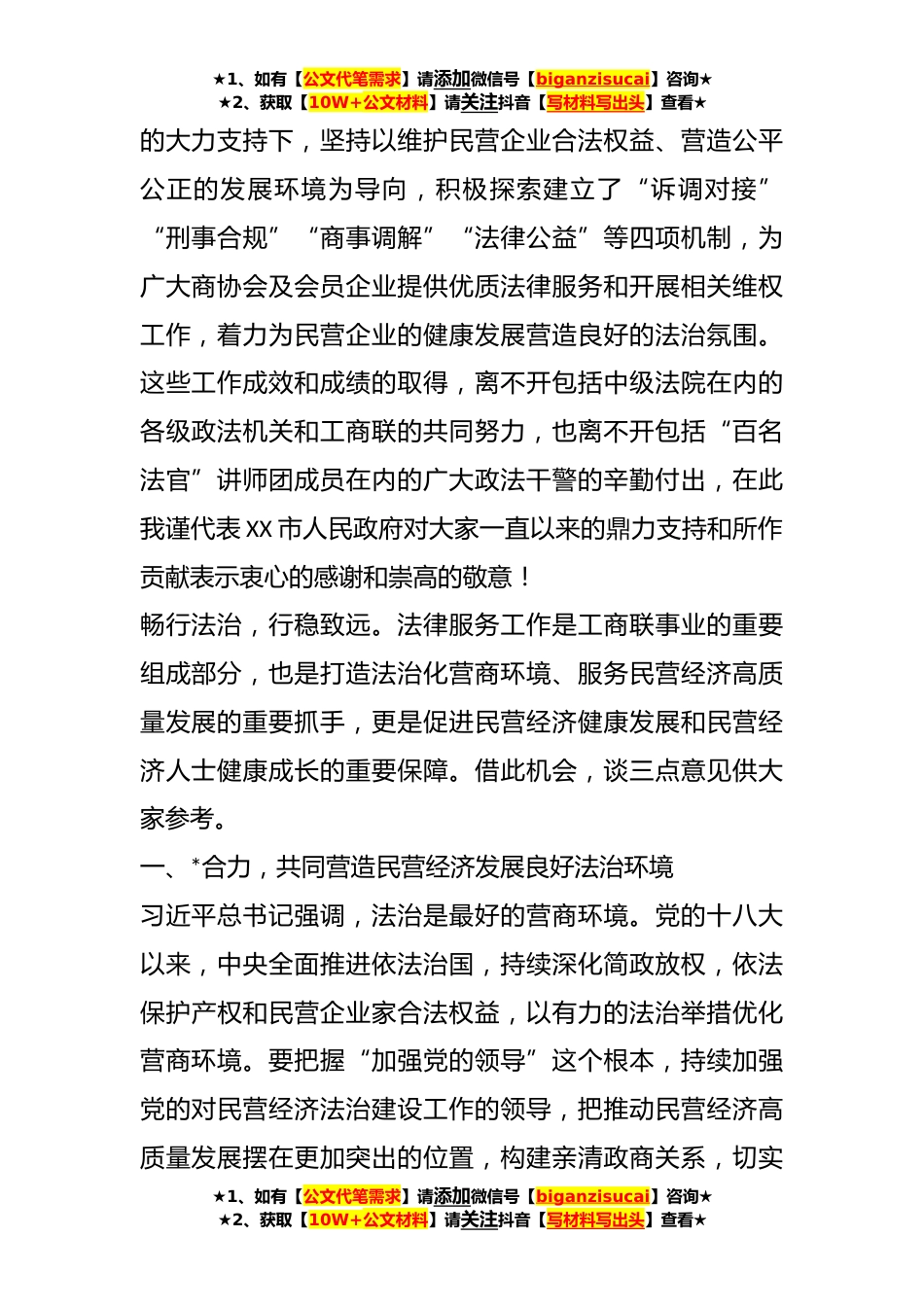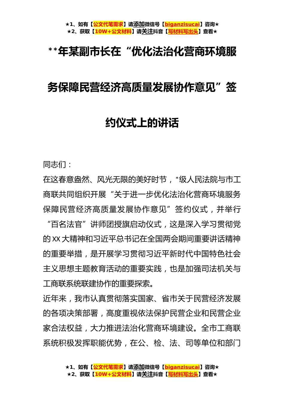 ★1、如有【公文代笔需求】请添加微信号【biganzisucai】咨询★★2、获取【10W+公文材料】请关注抖音【写材料写出头】查看★**年某副市长在“优化法治化营商环境服务保障民营经济高质量发展协作意见”签约仪式上的讲话同志们:在这春意盎然、风光无限的美好时节,*级人民法院与市工商联共同组织开展“关于进一步优化法治化营商环境服务保障民营经济高质量发展协作意见”签约仪式,并举行“百名法官”讲师团授旗启动仪式,这是深入学习贯彻党的XX大精神和习近平总书记在全国两会期间重要讲话精神的重要举措,是开展学习贯彻习近平新时代中国特色社会主义思想主题教育活动的重要实践,也是加强司法机关与工商联系统联建协作的重要探索。近年来,我市认真贯彻落实国家、省市关于民营经济发展的各项决策部署,高度重视...