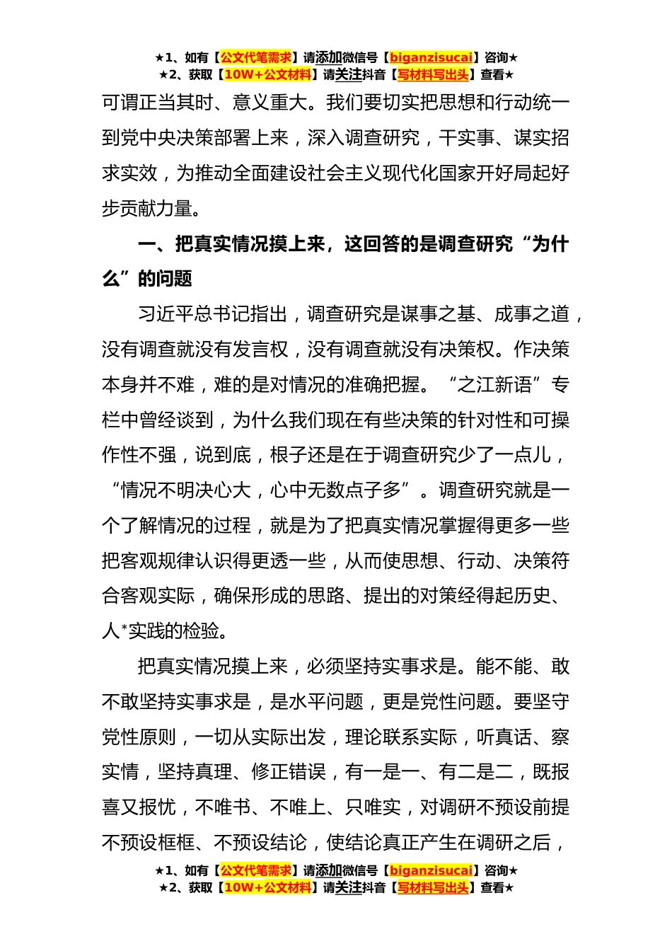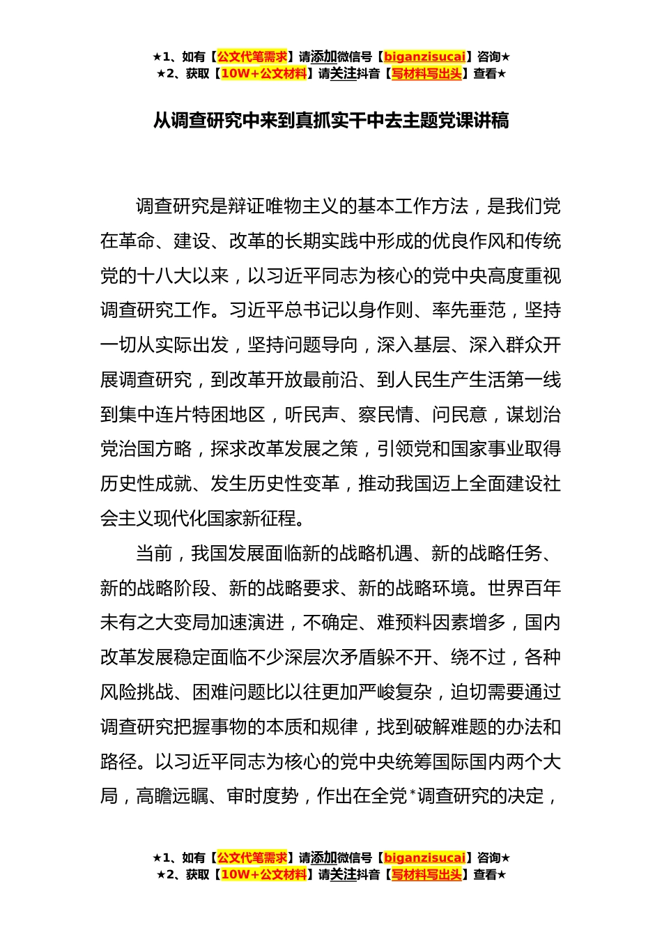 ★1、如有【公文代笔需求】请添加微信号【biganzisucai】咨询★★2、获取【10W+公文材料】请关注抖音【写材料写出头】查看★从调查研究中来到真抓实干中去主题党课讲稿调查研究是辩证唯物主义的基本工作方法,是我们党在革命、建设、改革的长期实践中形成的优良作风和传统党的十八大以来,以习近平同志为核心的党中央高度重视调查研究工作。习近平总书记以身作则、率先垂范,坚持一切从实际出发,坚持问题导向,深入基层、深入群众开展调查研究,到改革开放最前沿、到人民生产生活第一线到集中连片特困地区,听民声、察民情、问民意,谋划治党治国方略,探求改革发展之策,引领党和国家事业取得历史性成就、发生历史性变革,推动我国迈上全面建设社会主义现代化国家新征程。当前,我国发展面临新的战略机遇、新的...