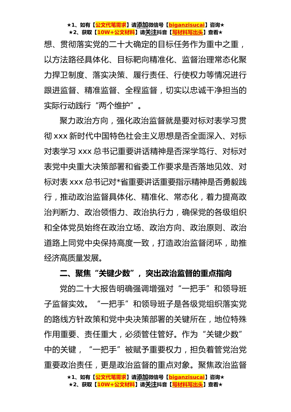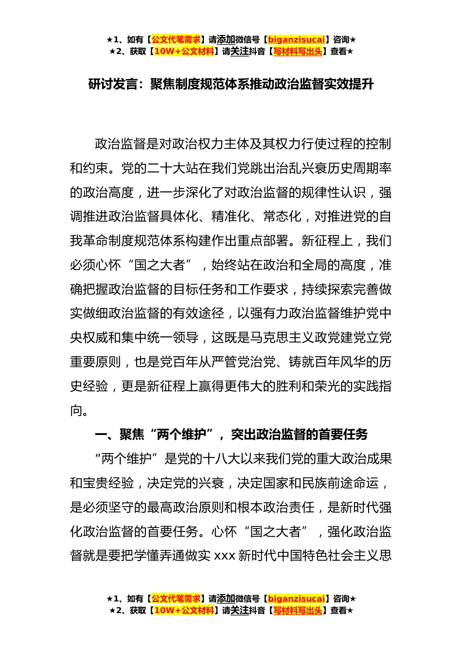 ★1、如有【公文代笔需求】请添加微信号【biganzisucai】咨询★★2、获取【10W+公文材料】请关注抖音【写材料写出头】查看★研讨发言:聚焦制度规范体系推动政治监督实效提升政治监督是对政治权力主体及其权力行使过程的控制和约束。党的二十大站在我们党跳出治乱兴衰历史周期率的政治高度,进一步深化了对政治监督的规律性认识,强调推进政治监督具体化、精准化、常态化,对推进党的自我革命制度规范体系构建作出重点部署。新征程上,我们必须心怀“国之大者”,始终站在政治和全局的高度,准确把握政治监督的目标任务和工作要求,持续探索完善做实做细政治监督的有效途径,以强有力政治监督维护党中央权威和集中统一领导,这既是马克思主义政党建党立党重要原则,也是党百年从严管党治党、铸就百年风华的历史经...