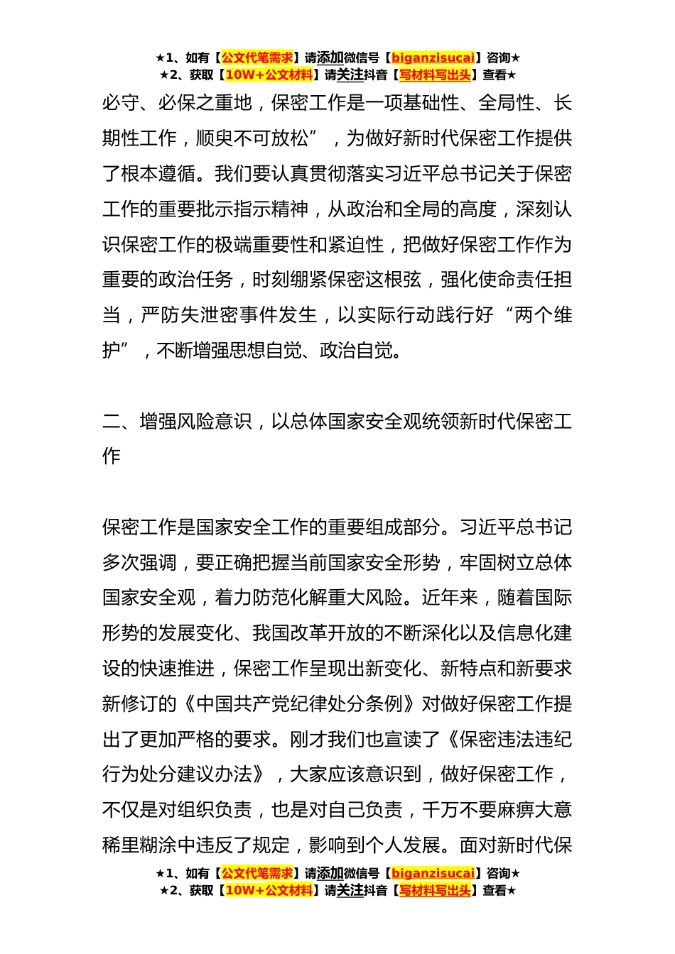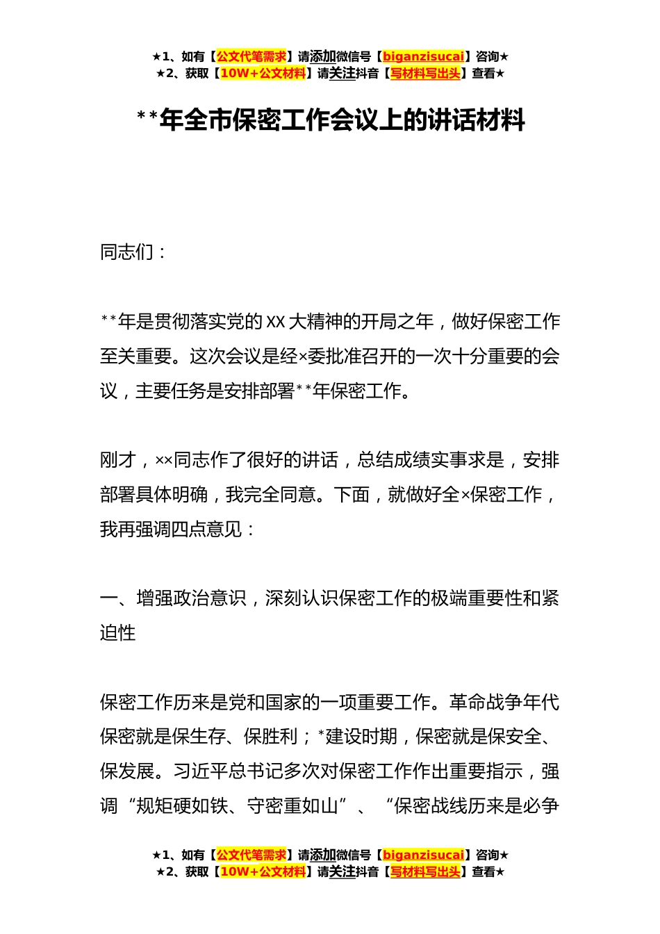 ★1、如有【公文代笔需求】请添加微信号【biganzisucai】咨询★★2、获取【10W+公文材料】请关注抖音【写材料写出头】查看★**年全市保密工作会议上的讲话材料同志们:**年是贯彻落实党的XX大精神的开局之年,做好保密工作至关重要。这次会议是经×委批准召开的一次十分重要的会议,主要任务是安排部署**年保密工作。刚才,××同志作了很好的讲话,总结成绩实事求是,安排部署具体明确,我完全同意。下面,就做好全×保密工作,我再强调四点意见:一、增强政治意识,深刻认识保密工作的极端重要性和紧迫性保密工作历来是党和国家的一项重要工作。革命战争年代保密就是保生存、保胜利;*建设时期,保密就是保安全、保发展。习近平总书记多次对保密工作作出重要指示,强调“规矩硬如铁、守密重如山”、“保密战线历...