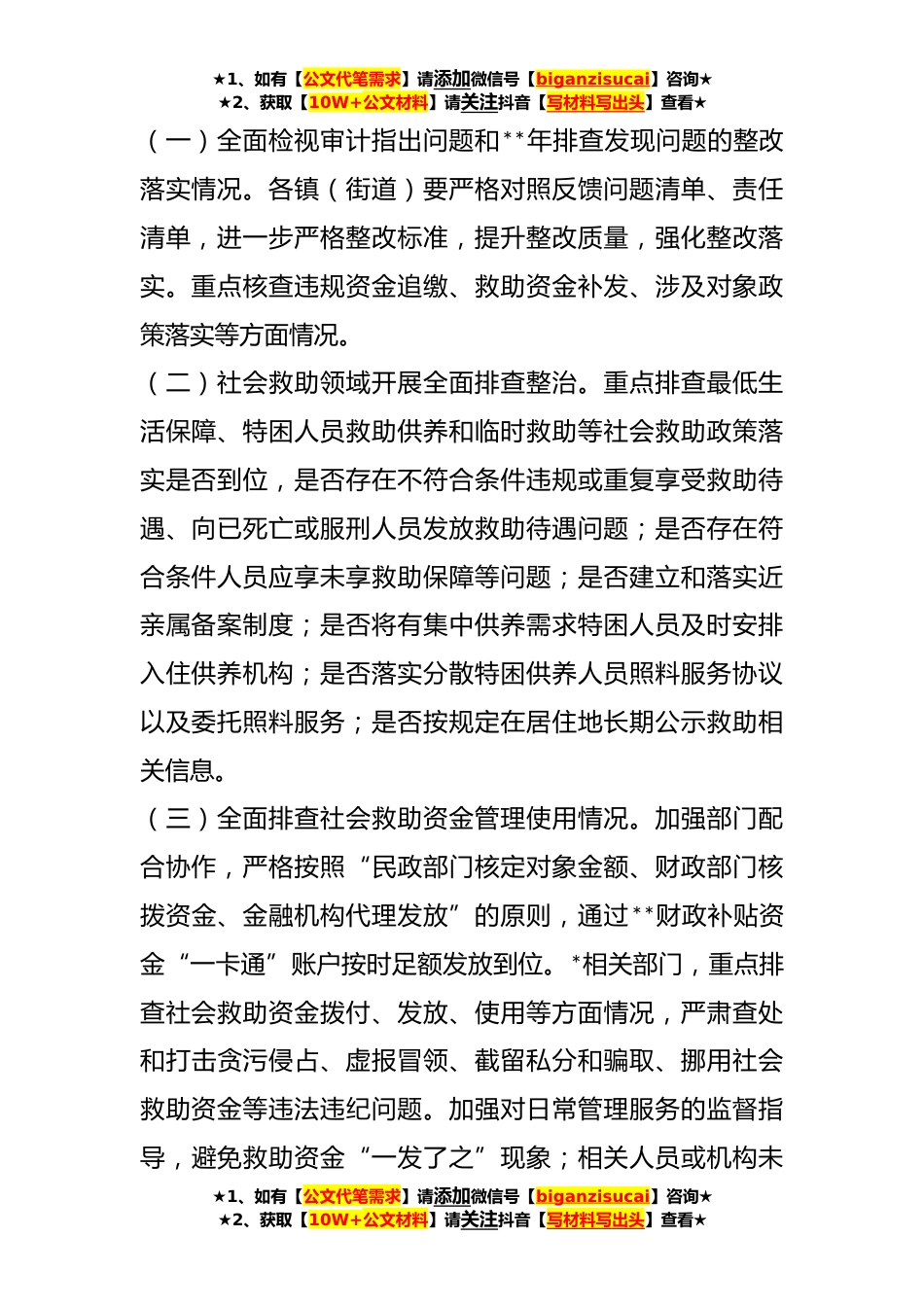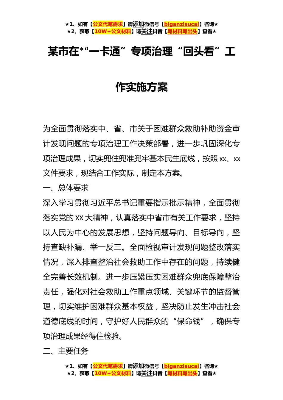 ★1、如有【公文代笔需求】请添加微信号【biganzisucai】咨询★★2、获取【10W+公文材料】请关注抖音【写材料写出头】查看★某市在*“一卡通”专项治理“回头看”工作实施方案为全面贯彻落实中、省、市关于困难群众救助补助资金审计发现问题的专项治理工作决策部署,进一步巩固深化专项治理成果,切实兜住兜准兜牢基本民生底线,按照xx、xx文件要求,现结合工作实际,制定本方案。一、总体要求深入学习贯彻习近平总书记重要指示批示精神,全面贯彻落实党的XX大精神,认真落实中省市有关工作要求,坚持以人民为中心的发展思想,坚持问题导向、目标导向,坚持查缺补漏、举一反三。全面检视审计发现问题整改落实情况,深入排查整治社会救助工作中存在的问题,持续健全完善长效机制。进一步压紧压实困难群众兜底保障整...