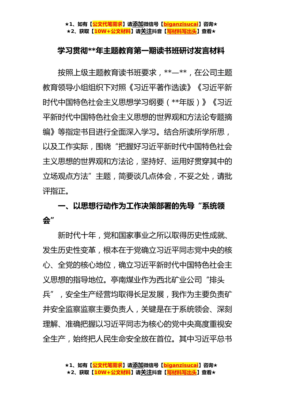 ★1、如有【公文代笔需求】请添加微信号【biganzisucai】咨询★★2、获取【10W+公文材料】请关注抖音【写材料写出头】查看★学习贯彻**年主题教育第一期读书班研讨发言材料按照上级主题教育读书班要求,**—**,在公司主题教育领导小组组织下对照《习近平著作选读》《习近平新时代中国特色社会主义思想学习纲要(**年版)》《习近平新时代中国特色社会主义思想的世界观和方法论专题摘编》等指定书目进行全面深入学习。结合所读所学所思,以及工作实际,围绕“把握好习近平新时代中国特色社会主义思想的世界观和方法论,坚持好、运用好贯穿其中的立场观点方法”主题,简要谈几点体会,不妥之处,请批评指正。一、以思想行动作为工作决策部署的先导“系统领会”新时代十年,党和国家事业之所以取得历史性成就、发生...
