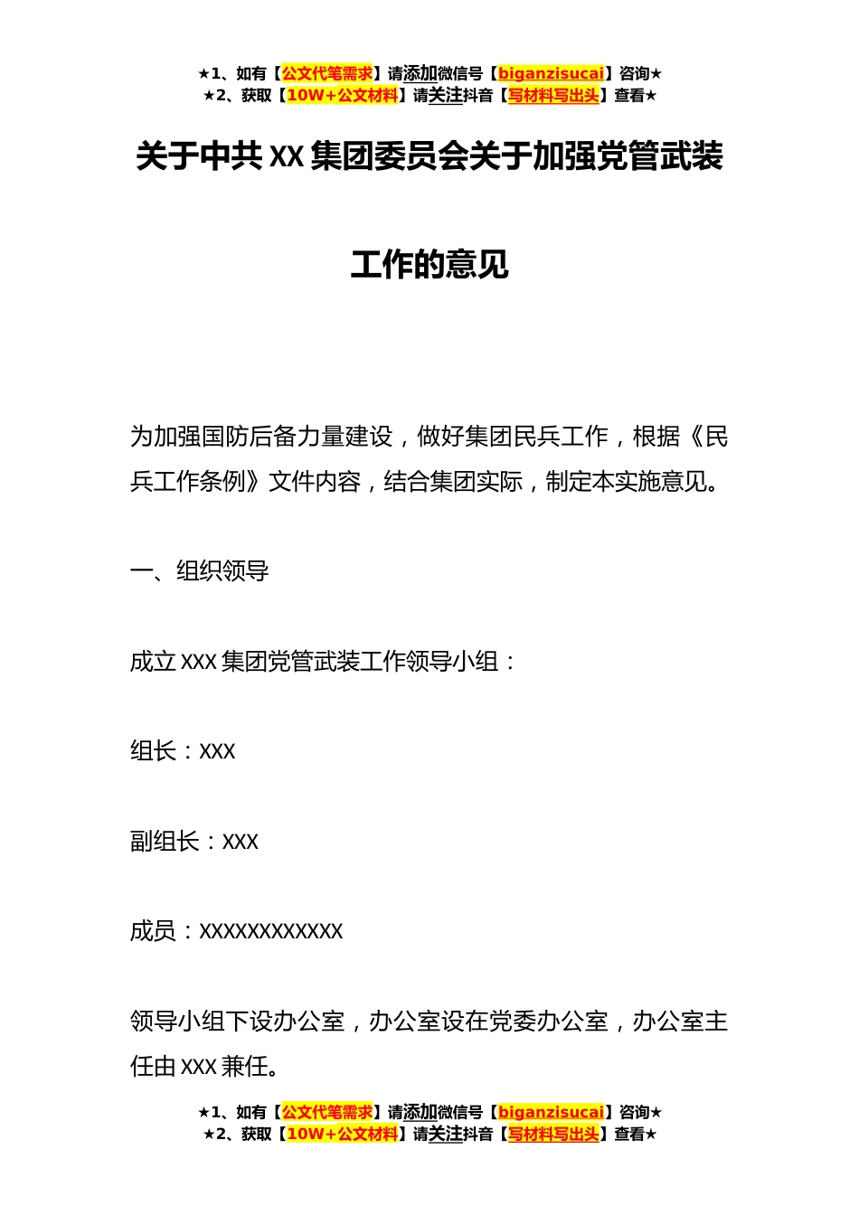 ★1、如有【公文代笔需求】请添加微信号【biganzisucai】咨询★★2、获取【10W+公文材料】请关注抖音【写材料写出头】查看★关于中共XX集团委员会关于加强党管武装工作的意见为加强国防后备力量建设,做好集团民兵工作,根据《民兵工作条例》文件内容,结合集团实际,制定本实施意见。一、组织领导成立XXX集团党管武装工作领导小组:组长:XXX副组长:XXX成员:XXXXXXXXXXXX领导小组下设办公室,办公室设在党委办公室,办公室主任由XXX兼任。★1、如有【公文代笔需求】请添加微信号【biganzisucai】咨询★★2、获取【10W+公文材料】请关注抖音【写材料写出头】查看★★1、如有【公文代笔需求】请添加微信号【biganzisucai】咨询★★2、获取【10W+公文材料】请关注抖音【写材料写出头】查看★二、主要任务(一)管...