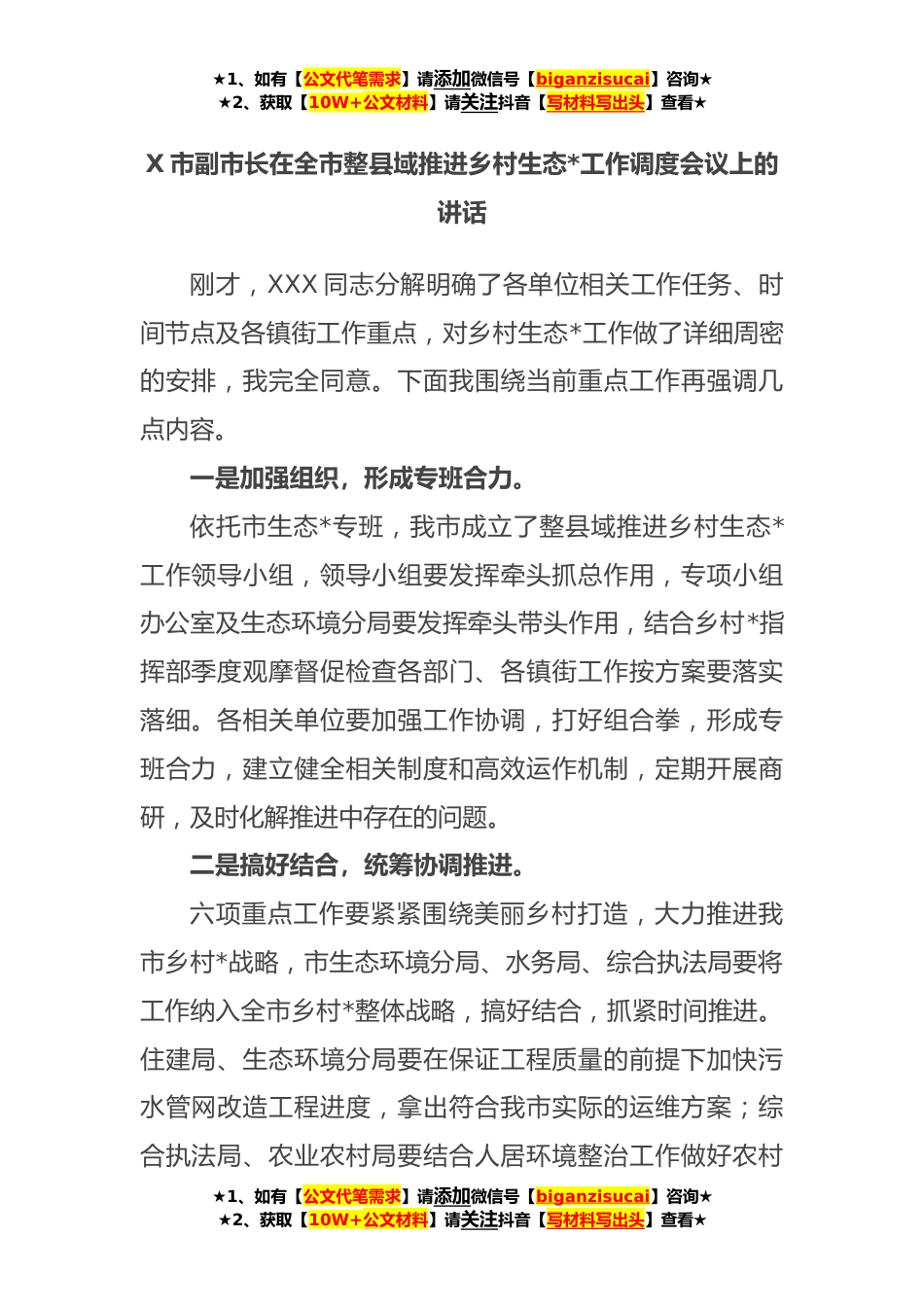 ★1、如有【公文代笔需求】请添加微信号【biganzisucai】咨询★★2、获取【10W+公文材料】请关注抖音【写材料写出头】查看★X市副市长在全市整县域推进乡村生态*工作调度会议上的讲话刚才,XXX同志分解明确了各单位相关工作任务、时间节点及各镇街工作重点,对乡村生态*工作做了详细周密的安排,我完全同意。下面我围绕当前重点工作再强调几点内容。一是加强组织,形成专班合力。依托市生态*专班,我市成立了整县域推进乡村生态*工作领导小组,领导小组要发挥牵头抓总作用,专项小组办公室及生态环境分局要发挥牵头带头作用,结合乡村*指挥部季度观摩督促检查各部门、各镇街工作按方案要落实落细。各相关单位要加强工作协调,打好组合拳,形成专班合力,建立健全相关制度和高效运作机制,定期开展商研,及时化解推...