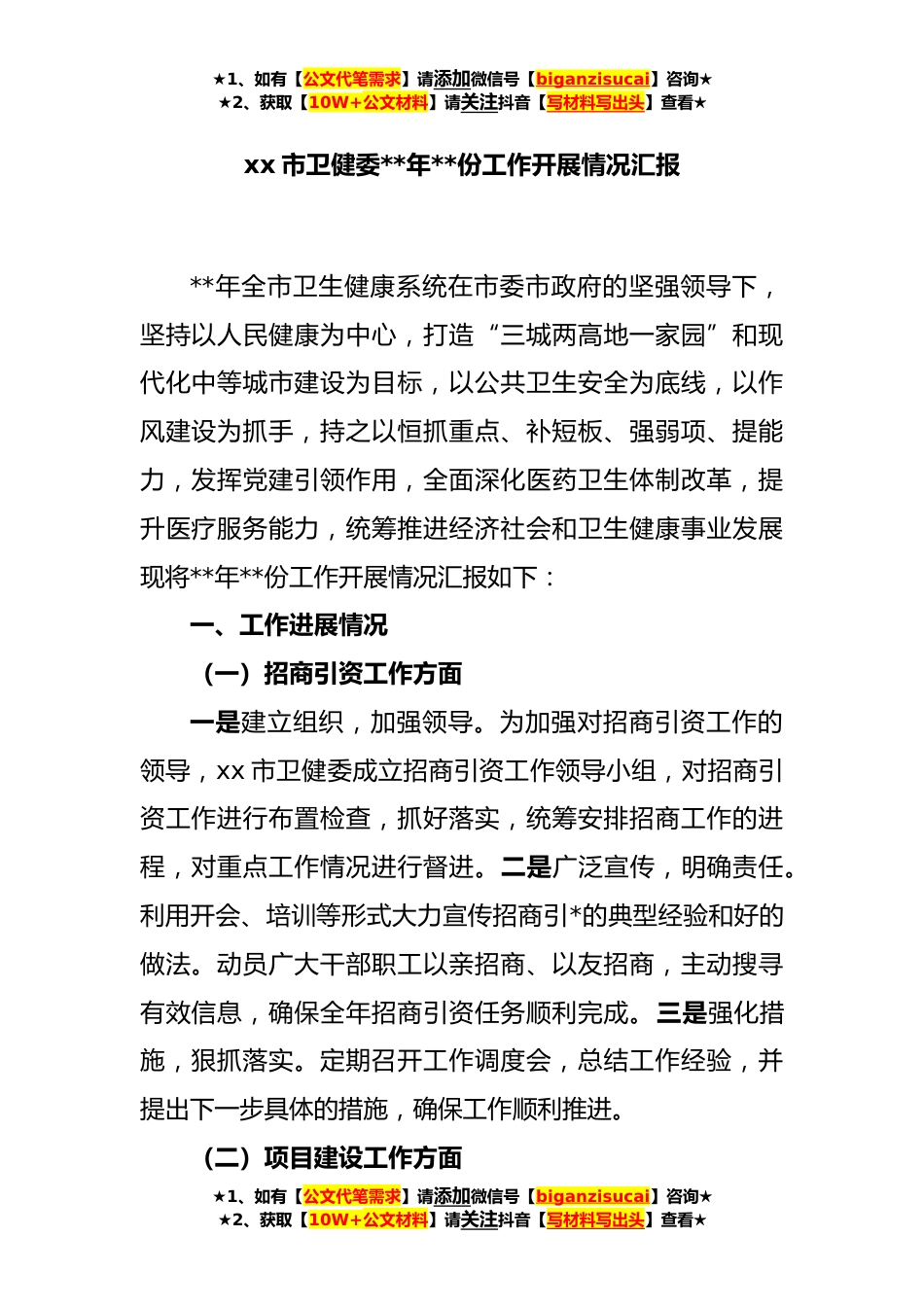 ★1、如有【公文代笔需求】请添加微信号【biganzisucai】咨询★★2、获取【10W+公文材料】请关注抖音【写材料写出头】查看★xx市卫健委**年**份工作开展情况汇报**年全市卫生健康系统在市委市政府的坚强领导下,坚持以人民健康为中心,打造“三城两高地一家园”和现代化中等城市建设为目标,以公共卫生安全为底线,以作风建设为抓手,持之以恒抓重点、补短板、强弱项、提能力,发挥党建引领作用,全面深化医药卫生体制改革,提升医疗服务能力,统筹推进经济社会和卫生健康事业发展现将**年**份工作开展情况汇报如下:一、工作进展情况(一)招商引资工作方面一是建立组织,加强领导。为加强对招商引资工作的领导,xx市卫健委成立招商引资工作领导小组,对招商引资工作进行布置检查,抓好落实,统筹安排招商工作的...