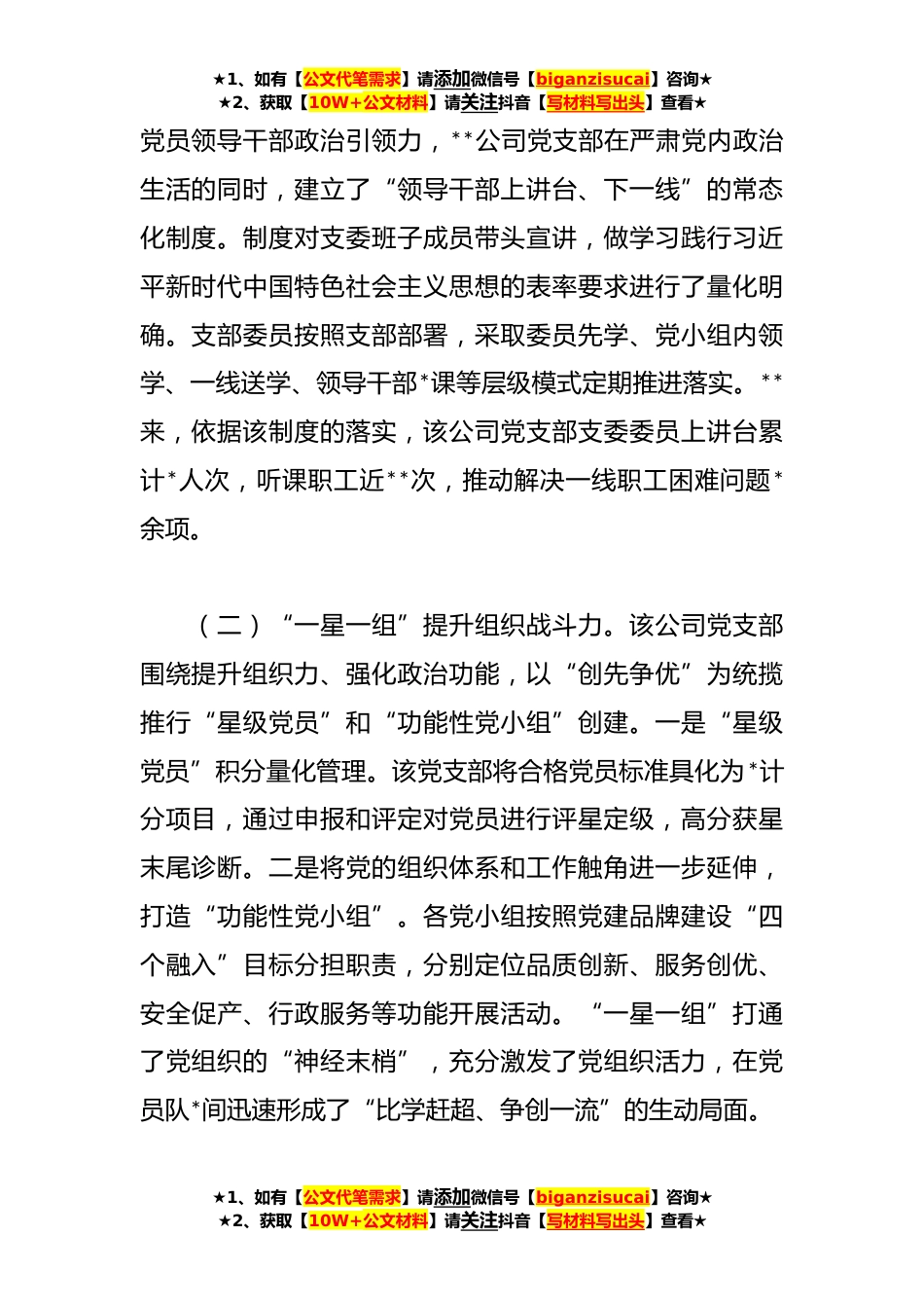 ★1、如有【公文代笔需求】请添加微信号【biganzisucai】咨询★★2、获取【10W+公文材料】请关注抖音【写材料写出头】查看★XX国企加强党建品牌建设与管理工作经验材料“雄鹰支部”是**公司党支部结合企业文化、经营理念以及企业所在的行业文化,打造的特色党建品牌。在党建品牌推进过程中,以“夯基础、创特色、树品牌”的建设目标,**公司党支部坚持以习近平新时代中国特色社会主义思想为指引,以融入“发展战略、创新创效、安全生产、人才保障”为核心,以提升党支部“政治引领力、组织战斗力、发展推动力、人才保障力”四力建设为目标,以“双翼(一)共振”为载体,构建了特色的党建品牌体系。全体党员紧紧围绕工作大局,打头阵、当先锋、出成绩,解决了诸多影响和制约生产经营发展的突出问题。党组织的凝聚...