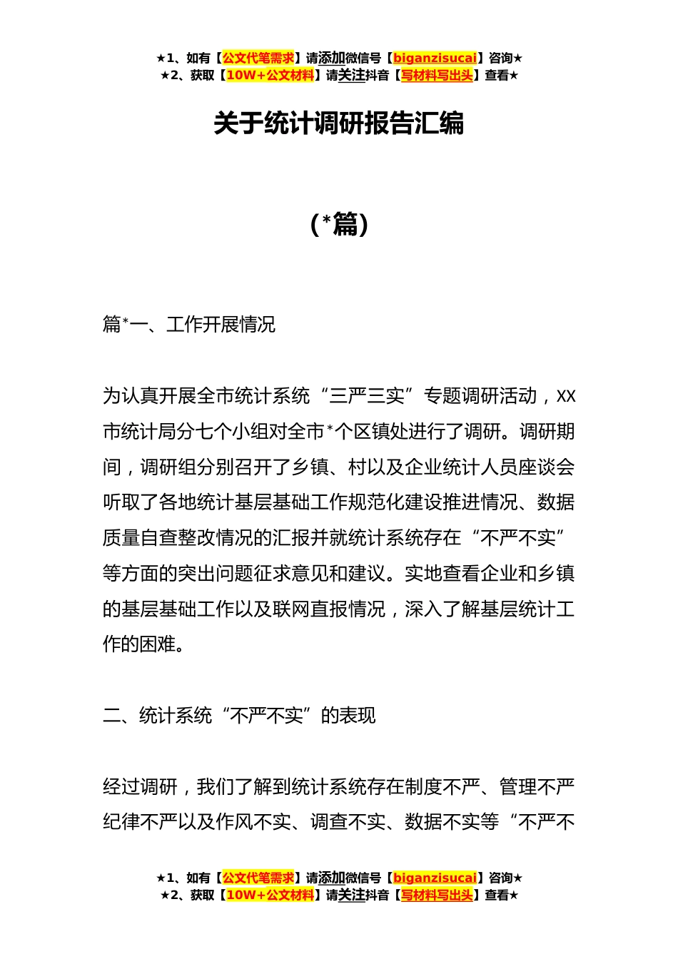 ★1、如有【公文代笔需求】请添加微信号【biganzisucai】咨询★★2、获取【10W+公文材料】请关注抖音【写材料写出头】查看★关于统计调研报告汇编(*篇)篇*一、工作开展情况为认真开展全市统计系统“三严三实”专题调研活动,XX市统计局分七个小组对全市*个区镇处进行了调研。调研期间,调研组分别召开了乡镇、村以及企业统计人员座谈会听取了各地统计基层基础工作规范化建设推进情况、数据质量自查整改情况的汇报并就统计系统存在“不严不实”等方面的突出问题征求意见和建议。实地查看企业和乡镇的基层基础工作以及联网直报情况,深入了解基层统计工作的困难。二、统计系统“不严不实”的表现经过调研,我们了解到统计系统存在制度不严、管理不严纪律不严以及作风不实、调查不实、数据不实等“不严不★1、如有...