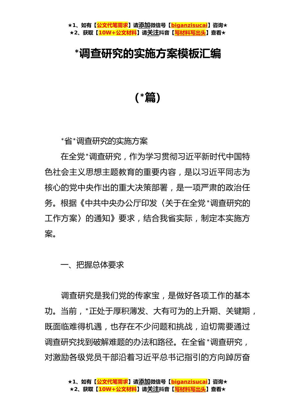 ★1、如有【公文代笔需求】请添加微信号【biganzisucai】咨询★★2、获取【10W+公文材料】请关注抖音【写材料写出头】查看★*调查研究的实施方案模板汇编(*篇)*省*调查研究的实施方案在全党*调查研究,作为学习贯彻习近平新时代中国特色社会主义思想主题教育的重要内容,是以习近平同志为核心的党中央作出的重大决策部署,是一项严肃的政治任务。根据《中共中央办公厅印发〈关于在全党*调查研究的工作方案〉的通知》要求,结合我省实际,制定本实施方案。一、把握总体要求调查研究是我们党的传家宝,是做好各项工作的基本功。当前,*正处于厚积薄发、大有可为的上升期、关键期,既面临难得机遇,也存在不少问题和挑战,迫切需要通过调查研究找到破解难题的办法和路径。在全省*调查研究,对激励各级党员干部沿着...