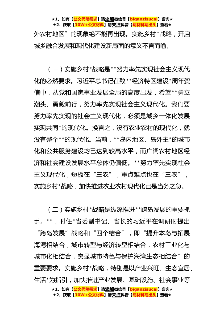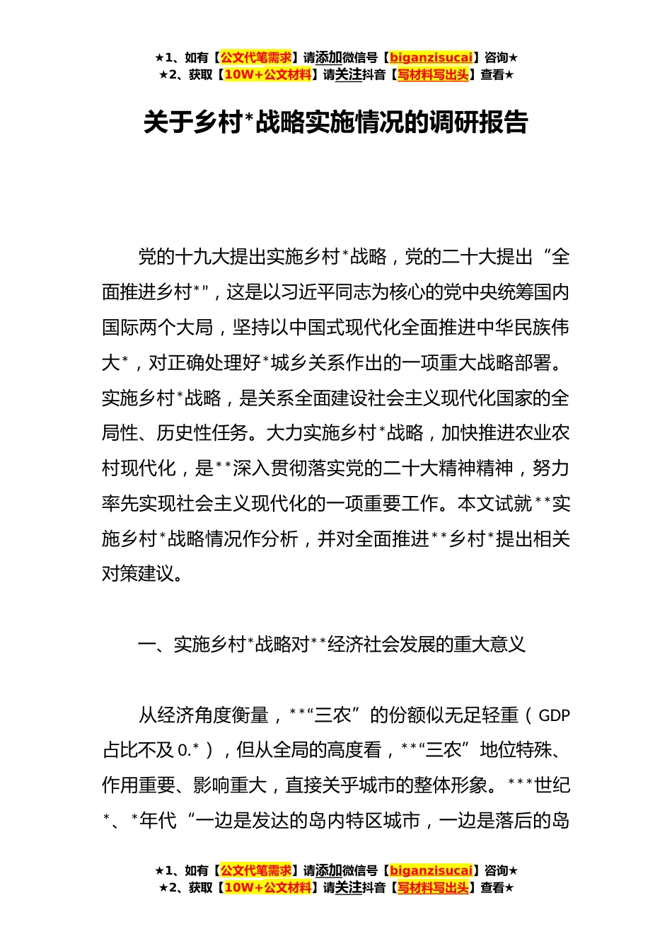★1、如有【公文代笔需求】请添加微信号【biganzisucai】咨询★★2、获取【10W+公文材料】请关注抖音【写材料写出头】查看★关于乡村*战略实施情况的调研报告党的十九大提出实施乡村*战略,党的二十大提出“全面推进乡村*”,这是以习近平同志为核心的党中央统筹国内国际两个大局,坚持以中国式现代化全面推进中华民族伟大*,对正确处理好*城乡关系作出的一项重大战略部署。实施乡村*战略,是关系全面建设社会主义现代化国家的全局性、历史性任务。大力实施乡村*战略,加快推进农业农村现代化,是**深入贯彻落实党的二十大精神精神,努力率先实现社会主义现代化的一项重要工作。本文试就**实施乡村*战略情况作分析,并对全面推进**乡村*提出相关对策建议。一、实施乡村*战略对**经济社会发展的重大意义从经济角度...