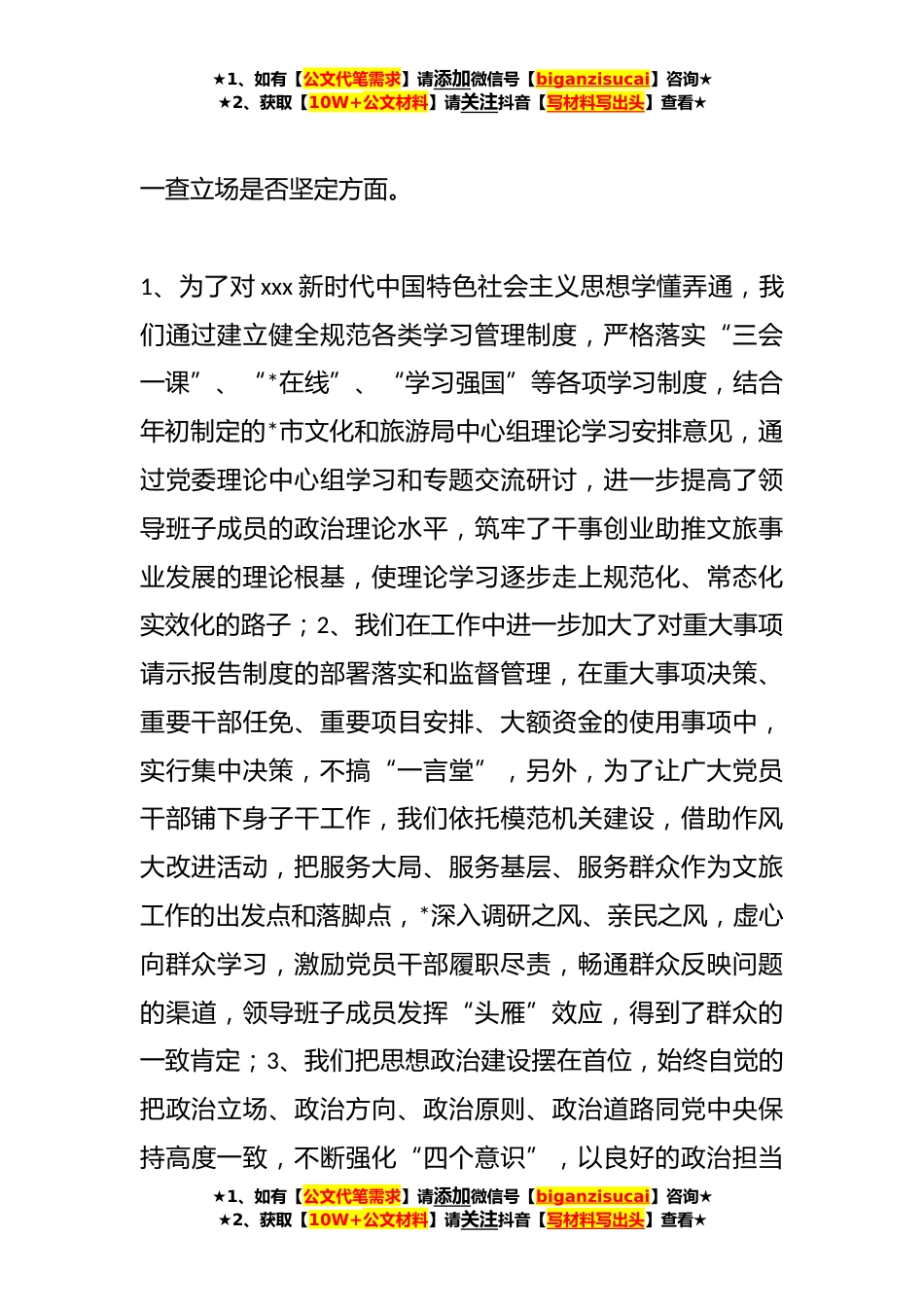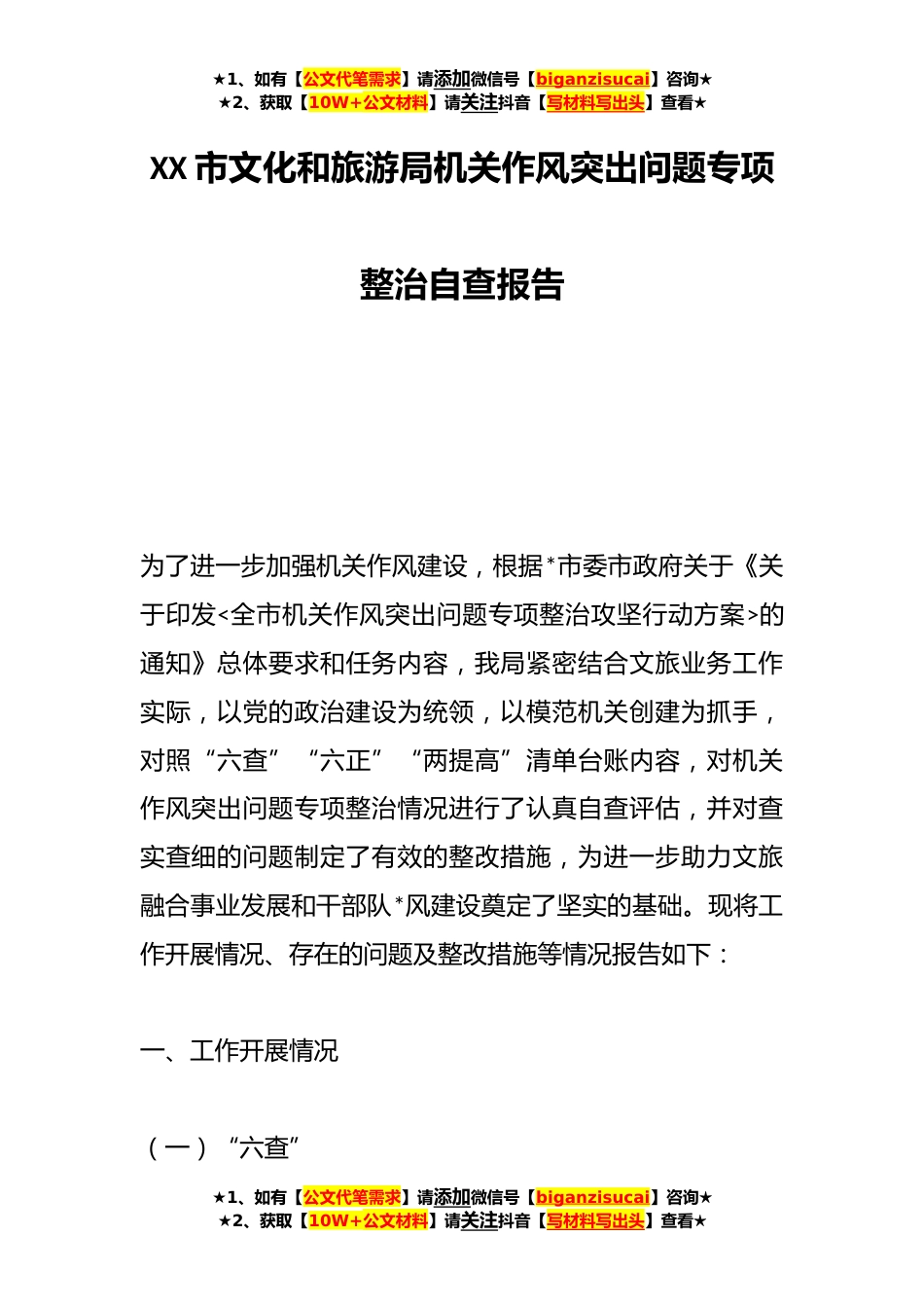 ★1、如有【公文代笔需求】请添加微信号【biganzisucai】咨询★★2、获取【10W+公文材料】请关注抖音【写材料写出头】查看★XX市文化和旅游局机关作风突出问题专项整治自查报告为了进一步加强机关作风建设,根据*市委市政府关于《关于印发<全市机关作风突出问题专项整治攻坚行动方案>的通知》总体要求和任务内容,我局紧密结合文旅业务工作实际,以党的政治建设为统领,以模范机关创建为抓手,对照“六查”“六正”“两提高”清单台账内容,对机关作风突出问题专项整治情况进行了认真自查评估,并对查实查细的问题制定了有效的整改措施,为进一步助力文旅融合事业发展和干部队*风建设奠定了坚实的基础。现将工作开展情况、存在的问题及整改措施等情况报告如下:一、工作开展情况(一)“六查”★1、如有【公文代笔...