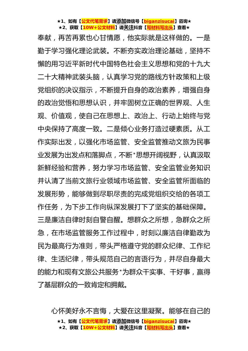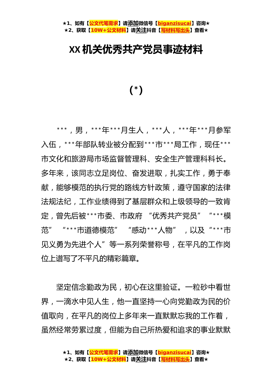 ★1、如有【公文代笔需求】请添加微信号【biganzisucai】咨询★★2、获取【10W+公文材料】请关注抖音【写材料写出头】查看★XX机关优秀共产党员事迹材料(*)***,男,***年***月生人,***人,***年***月参军入伍,***年部队转业被分配到***市***局工作,现任***市文化和旅游局市场监督管理科、安全生产管理科科长。多年来,该同志立足岗位、奋发进取,扎实工作,勇于奉献,能够模范的执行党的路线方针政策,遵守国家的法律法规法纪,工作业绩得到了基层群众和上级领导的一致肯定,曾先后被***市委、市政府“优秀共产党员”“***模范”“***市道德模范”“感动***人物”,以及“***市见义勇为先进个人”等一系列荣誉称号,在平凡的工作岗位上谱写了不平凡的精彩篇章。坚定信念勤政为民,初心在这里验证。一粒砂中...