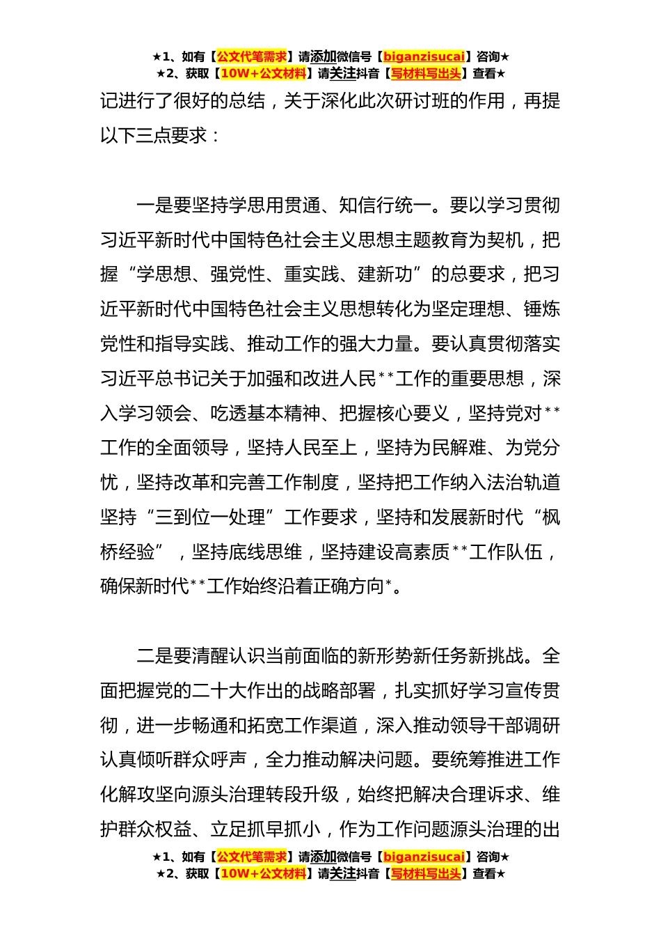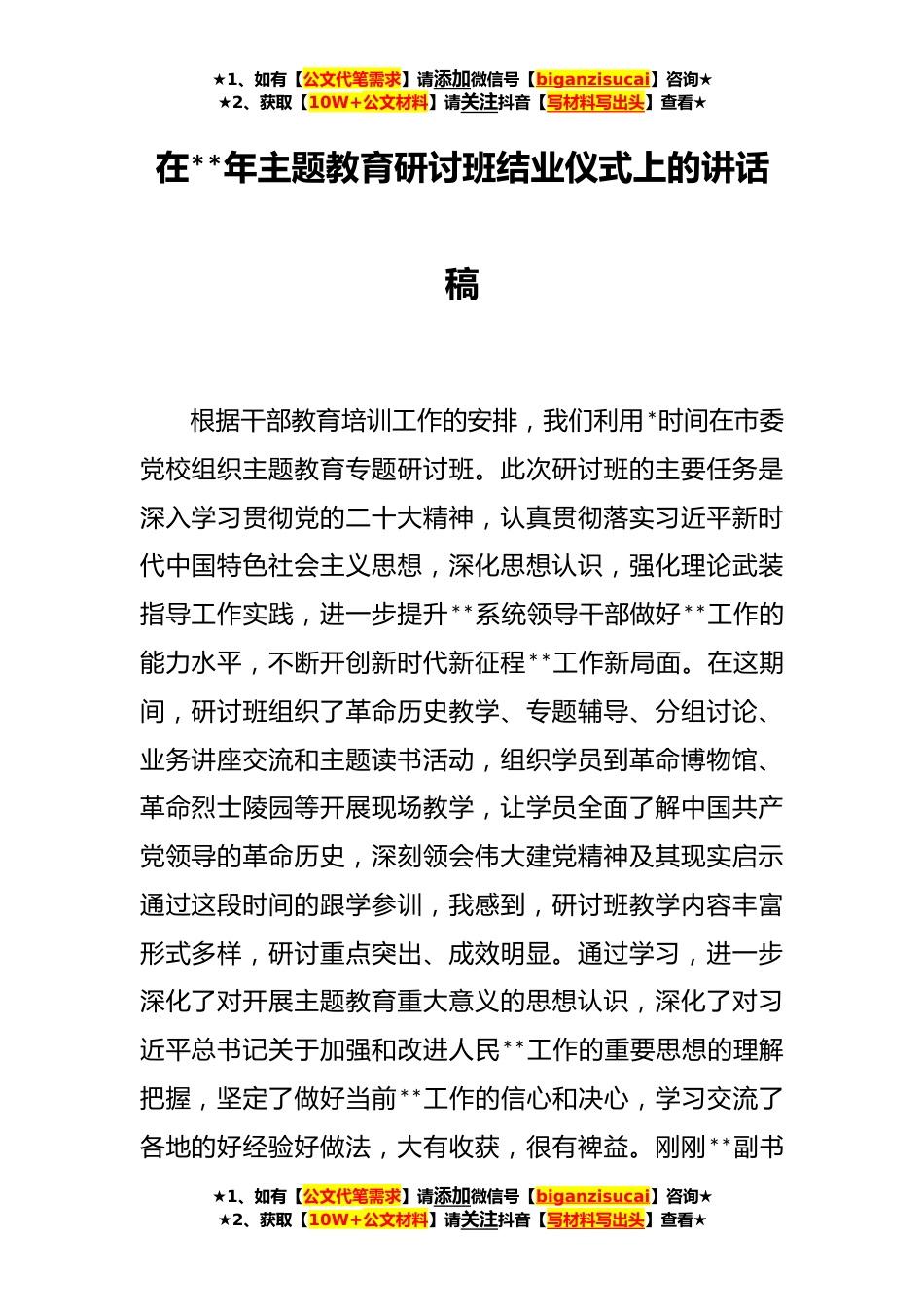 ★1、如有【公文代笔需求】请添加微信号【biganzisucai】咨询★★2、获取【10W+公文材料】请关注抖音【写材料写出头】查看★在**年主题教育研讨班结业仪式上的讲话稿根据干部教育培训工作的安排,我们利用*时间在市委党校组织主题教育专题研讨班。此次研讨班的主要任务是深入学习贯彻党的二十大精神,认真贯彻落实习近平新时代中国特色社会主义思想,深化思想认识,强化理论武装指导工作实践,进一步提升**系统领导干部做好**工作的能力水平,不断开创新时代新征程**工作新局面。在这期间,研讨班组织了革命历史教学、专题辅导、分组讨论、业务讲座交流和主题读书活动,组织学员到革命博物馆、革命烈士陵园等开展现场教学,让学员全面了解中国共产党领导的革命历史,深刻领会伟大建党精神及其现实启示通过这段时间...