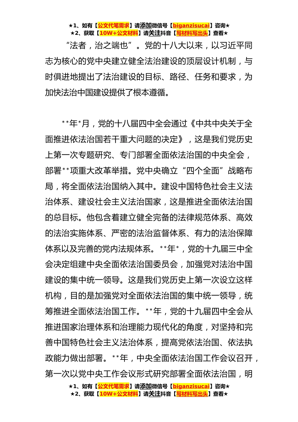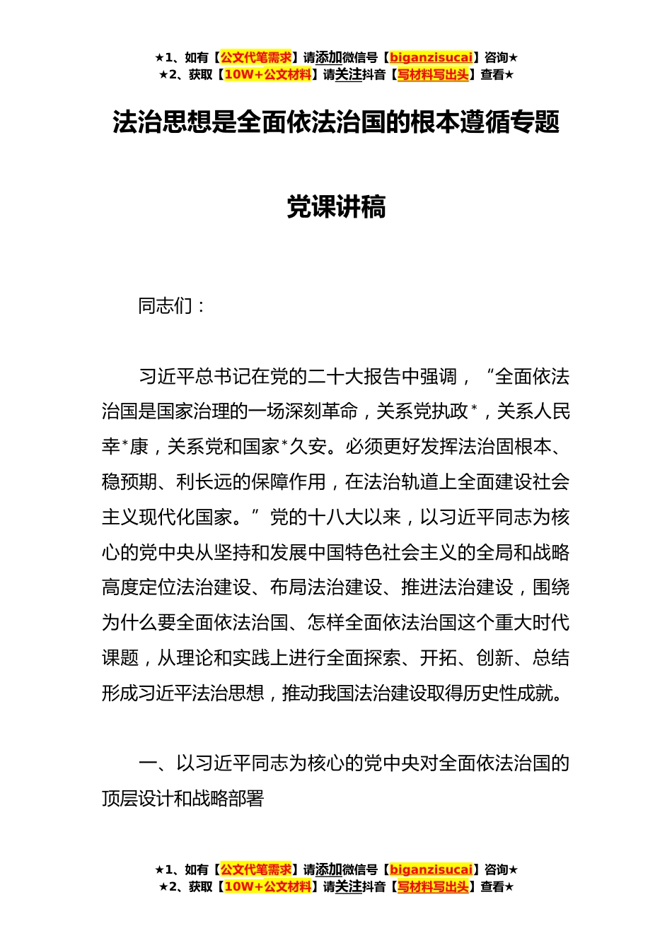 ★1、如有【公文代笔需求】请添加微信号【biganzisucai】咨询★★2、获取【10W+公文材料】请关注抖音【写材料写出头】查看★法治思想是全面依法治国的根本遵循专题党课讲稿同志们:习近平总书记在党的二十大报告中强调,“全面依法治国是国家治理的一场深刻革命,关系党执政*,关系人民幸*康,关系党和国家*久安。必须更好发挥法治固根本、稳预期、利长远的保障作用,在法治轨道上全面建设社会主义现代化国家。”党的十八大以来,以习近平同志为核心的党中央从坚持和发展中国特色社会主义的全局和战略高度定位法治建设、布局法治建设、推进法治建设,围绕为什么要全面依法治国、怎样全面依法治国这个重大时代课题,从理论和实践上进行全面探索、开拓、创新、总结形成习近平法治思想,推动我国法治建设取得历史性成...