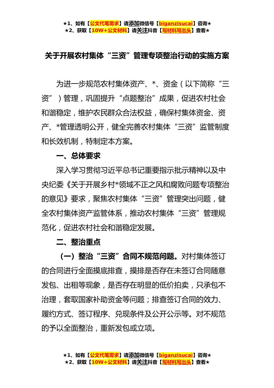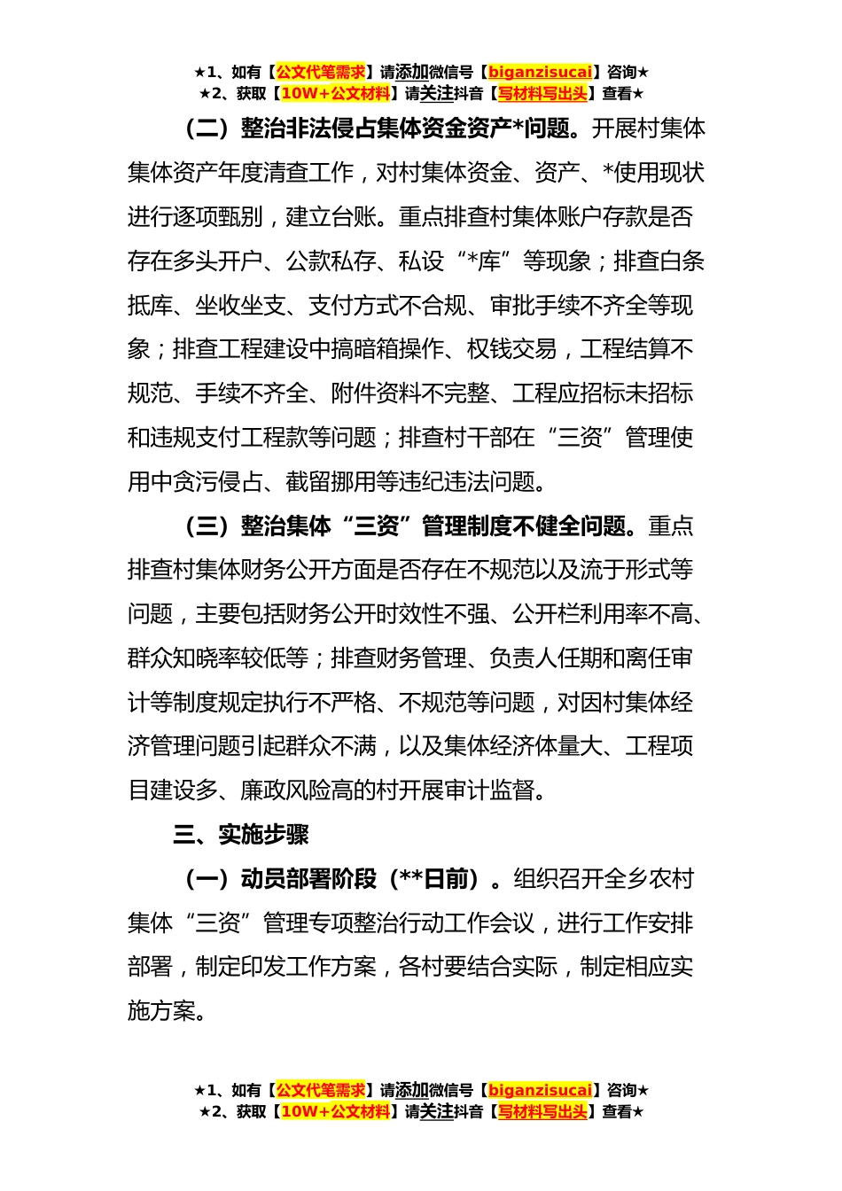 ★1、如有【公文代笔需求】请添加微信号【biganzisucai】咨询★★2、获取【10W+公文材料】请关注抖音【写材料写出头】查看★关于开展农村集体“三资”管理专项整治行动的实施方案为进一步规范农村集体资产、*、资金(以下简称“三资”)管理,巩固提升“点题整治”成果,促进农村社会和谐稳定,维护农民群众合法权益,确保村集体资金、资产、*管理透明公开,健全完善农村集体“三资”监管制度和长效机制,特制定本方案。一、总体要求深入学习贯彻习近平总书记重要指示批示精神以及中央纪委《关于开展乡村*领域不正之风和腐败问题专项整治的意见》要求,聚焦农村集体“三资”管理突出问题,健全农村集体资产监管体系,推动农村集体“三资”管理规范化,促进农村社会和谐稳定发展。二、整治重点(一)整治“三资”合...