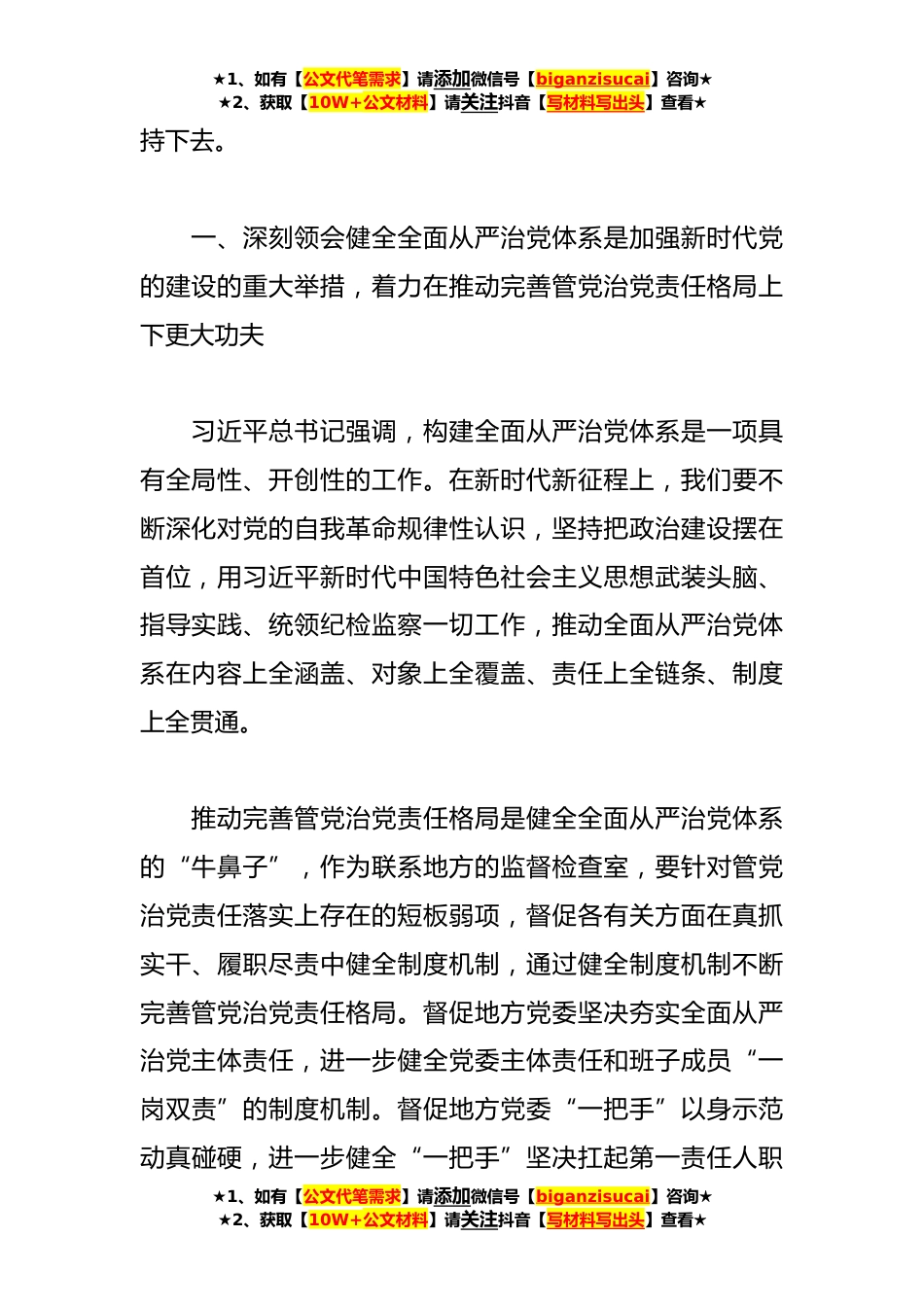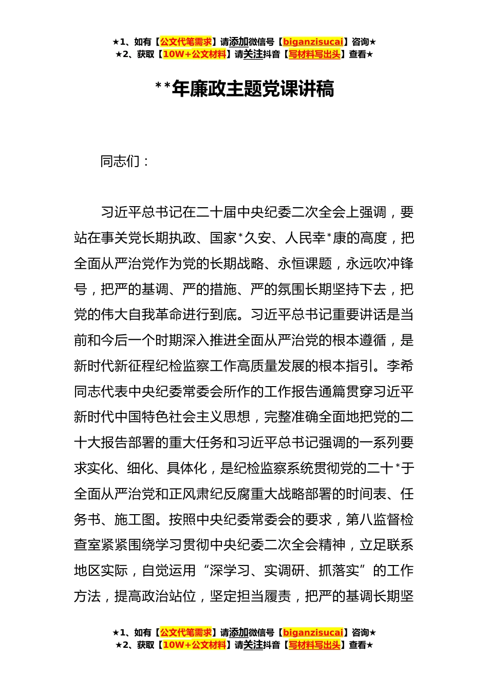★1、如有【公文代笔需求】请添加微信号【biganzisucai】咨询★★2、获取【10W+公文材料】请关注抖音【写材料写出头】查看★**年廉政主题党课讲稿同志们:习近平总书记在二十届中央纪委二次全会上强调,要站在事关党长期执政、国家*久安、人民幸*康的高度,把全面从严治党作为党的长期战略、永恒课题,永远吹冲锋号,把严的基调、严的措施、严的氛围长期坚持下去,把党的伟大自我革命进行到底。习近平总书记重要讲话是当前和今后一个时期深入推进全面从严治党的根本遵循,是新时代新征程纪检监察工作高质量发展的根本指引。李希同志代表中央纪委常委会所作的工作报告通篇贯穿习近平新时代中国特色社会主义思想,完整准确全面地把党的二十大报告部署的重大任务和习近平总书记强调的一系列要求实化、细化、具体化,...