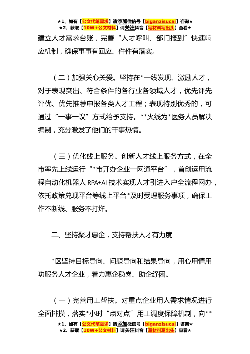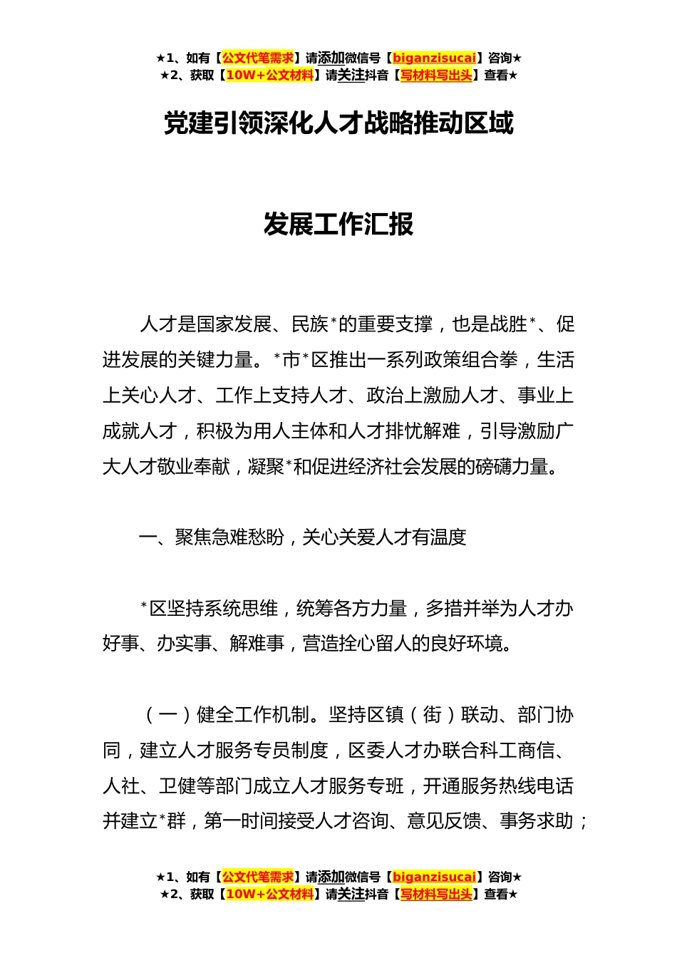 ★1、如有【公文代笔需求】请添加微信号【biganzisucai】咨询★★2、获取【10W+公文材料】请关注抖音【写材料写出头】查看★党建引领深化人才战略推动区域发展工作汇报人才是国家发展、民族*的重要支撑,也是战胜*、促进发展的关键力量。*市*区推出一系列政策组合拳,生活上关心人才、工作上支持人才、政治上激励人才、事业上成就人才,积极为用人主体和人才排忧解难,引导激励广大人才敬业奉献,凝聚*和促进经济社会发展的磅礴力量。一、聚焦急难愁盼,关心关爱人才有温度*区坚持系统思维,统筹各方力量,多措并举为人才办好事、办实事、解难事,营造拴心留人的良好环境。(一)健全工作机制。坚持区镇(街)联动、部门协同,建立人才服务专员制度,区委人才办联合科工商信、人社、卫健等部门成立人才服务专班,...