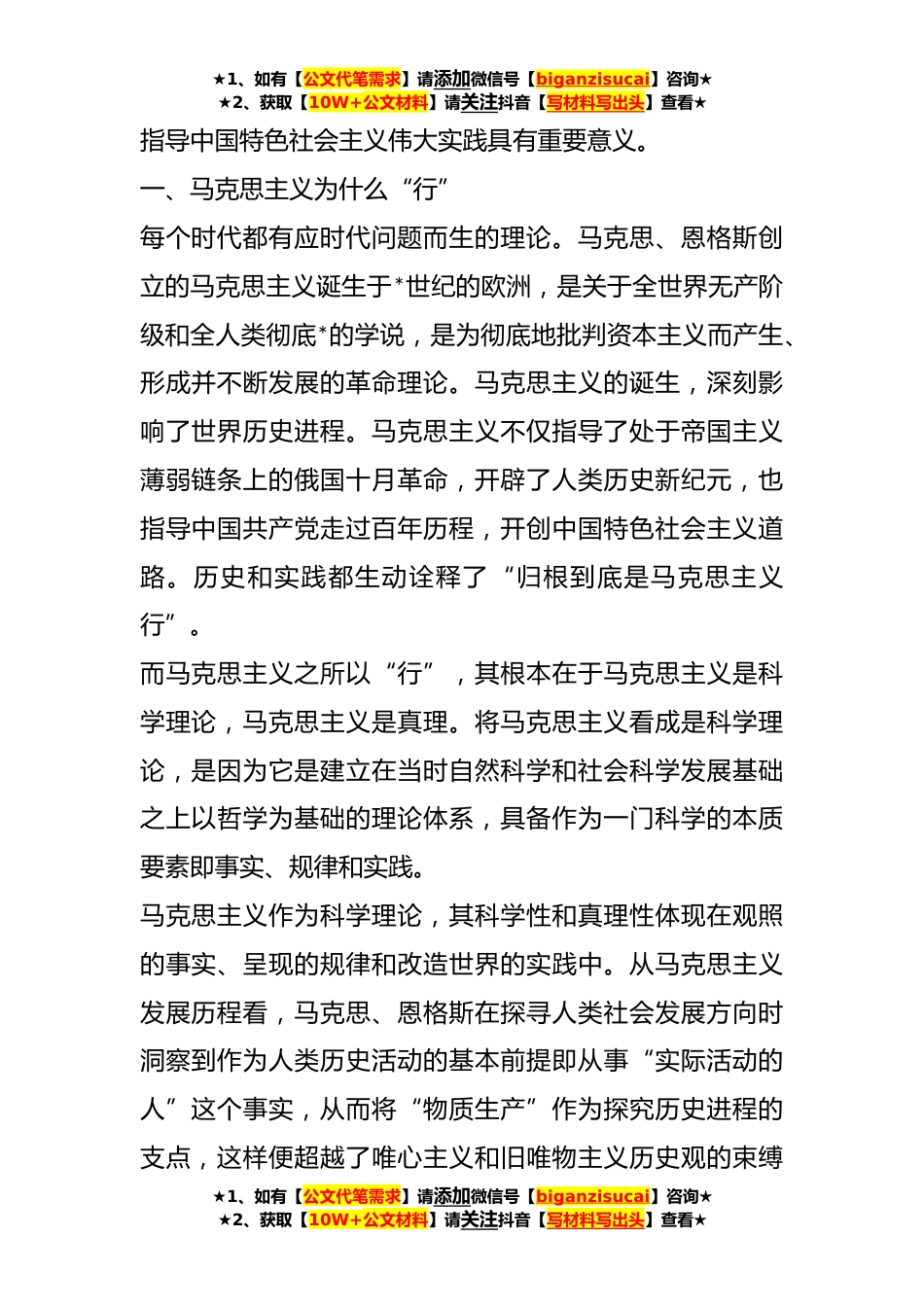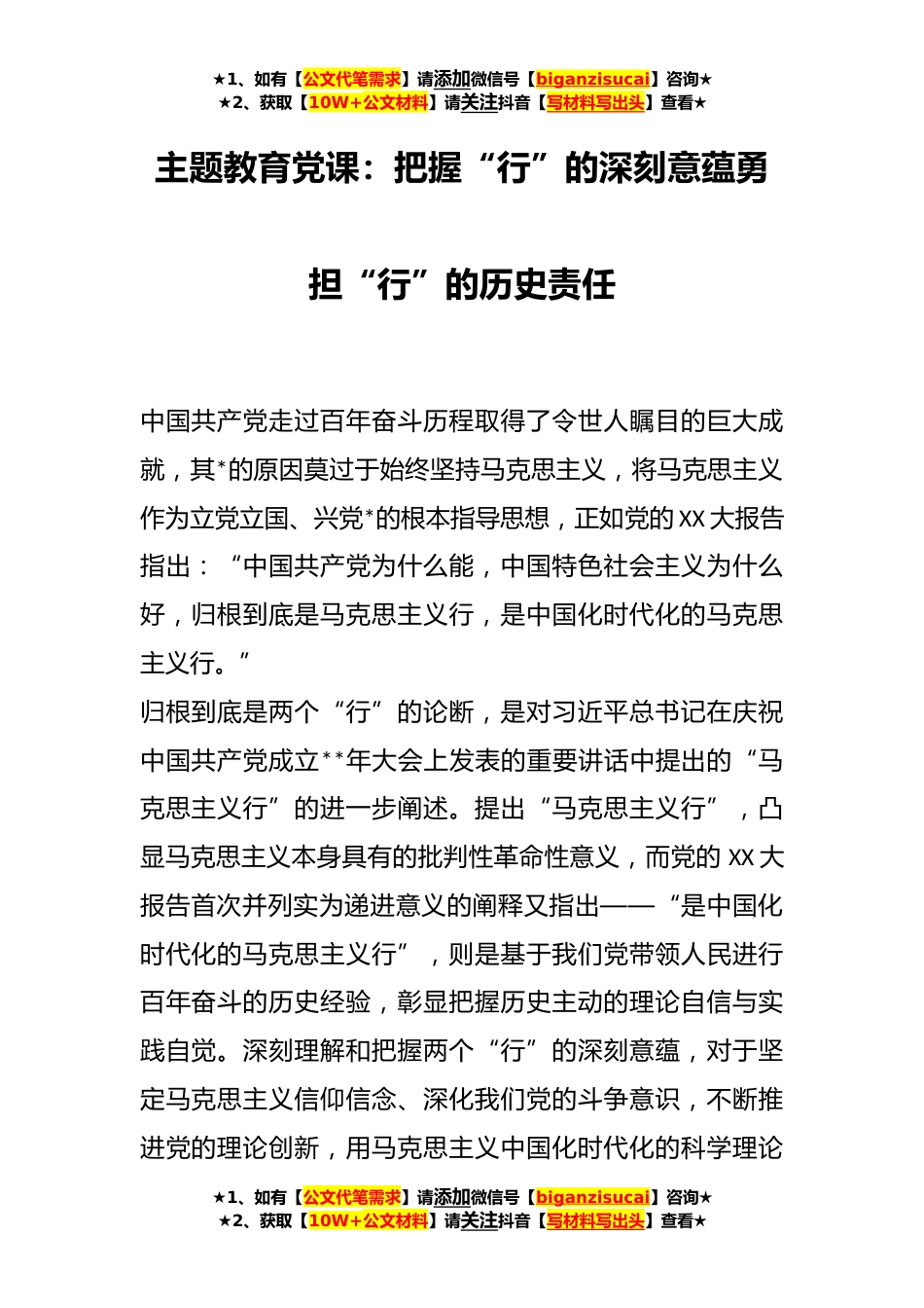 ★1、如有【公文代笔需求】请添加微信号【biganzisucai】咨询★★2、获取【10W+公文材料】请关注抖音【写材料写出头】查看★主题教育党课:把握“行”的深刻意蕴勇担“行”的历史责任中国共产党走过百年奋斗历程取得了令世人瞩目的巨大成就,其*的原因莫过于始终坚持马克思主义,将马克思主义作为立党立国、兴党*的根本指导思想,正如党的XX大报告指出:“中国共产党为什么能,中国特色社会主义为什么好,归根到底是马克思主义行,是中国化时代化的马克思主义行。”归根到底是两个“行”的论断,是对习近平总书记在庆祝中国共产党成立**年大会上发表的重要讲话中提出的“马克思主义行”的进一步阐述。提出“马克思主义行”,凸显马克思主义本身具有的批判性革命性意义,而党的XX大报告首次并列实为递进意义的阐释...