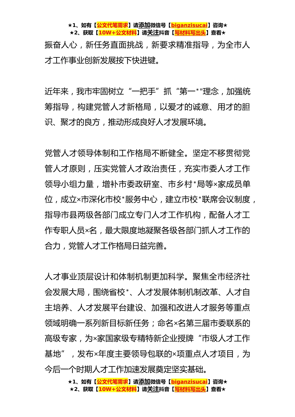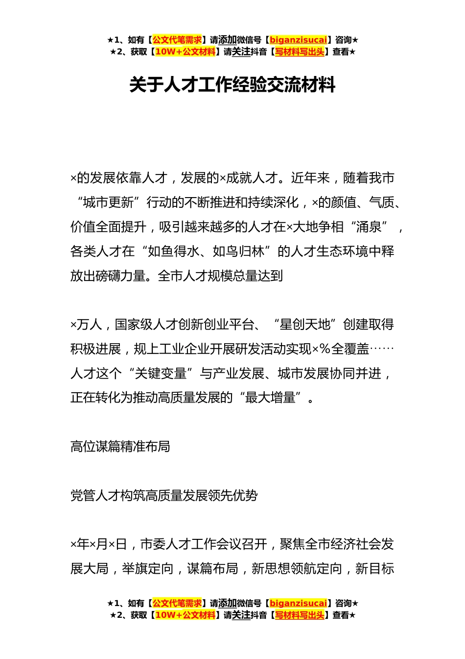 ★1、如有【公文代笔需求】请添加微信号【biganzisucai】咨询★★2、获取【10W+公文材料】请关注抖音【写材料写出头】查看★关于人才工作经验交流材料×的发展依靠人才,发展的×成就人才。近年来,随着我市“城市更新”行动的不断推进和持续深化,×的颜值、气质、价值全面提升,吸引越来越多的人才在×大地争相“涌泉”,各类人才在“如鱼得水、如鸟归林”的人才生态环境中释放出磅礴力量。全市人才规模总量达到×万人,国家级人才创新创业平台、“星创天地”创建取得积极进展,规上工业企业开展研发活动实现×%全覆盖⋯⋯人才这个“关键变量”与产业发展、城市发展协同并进,正在转化为推动高质量发展的“最大增量”。高位谋篇精准布局党管人才构筑高质量发展领先优势×年×月×日,市委人才工作会议召开,聚...
