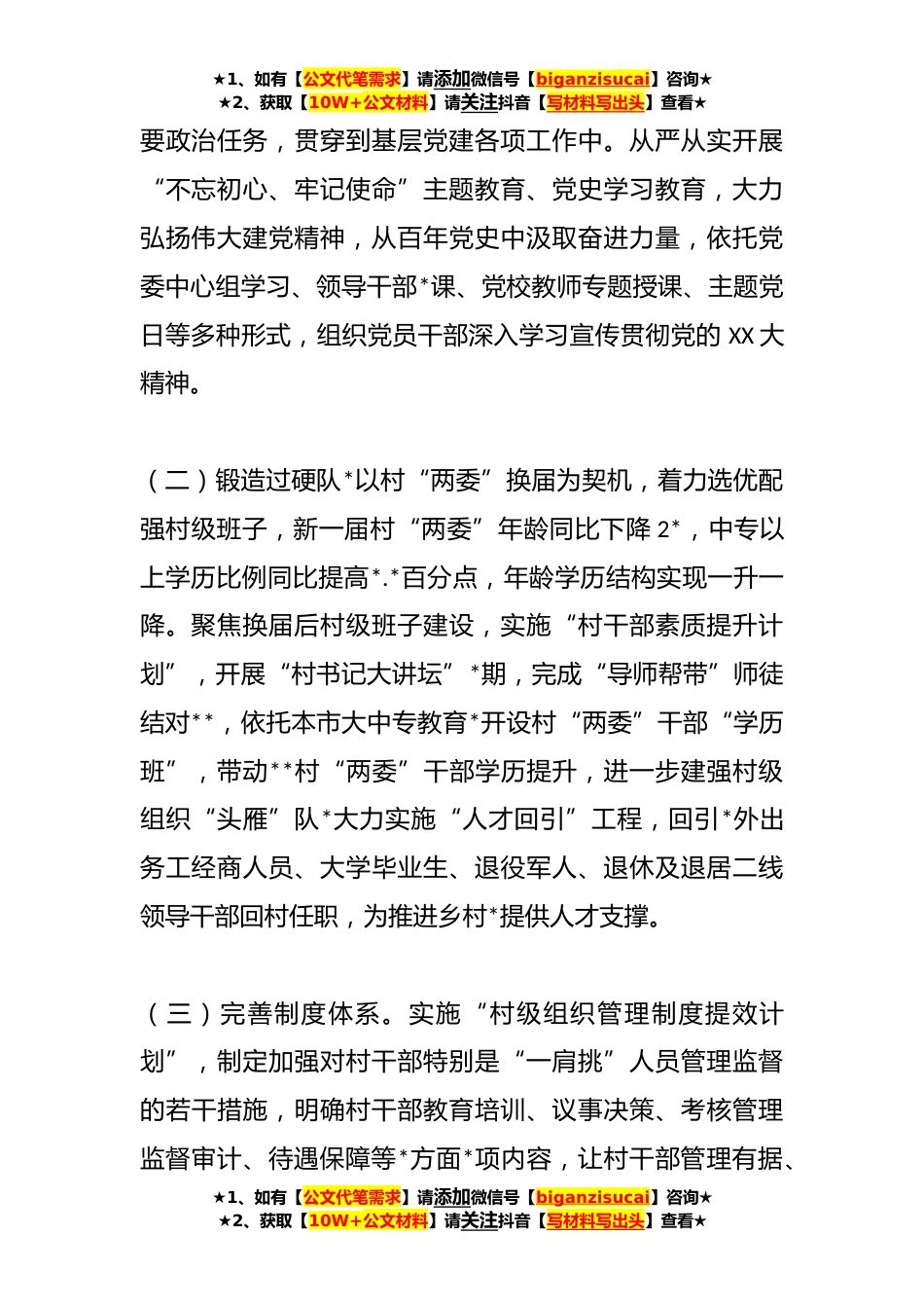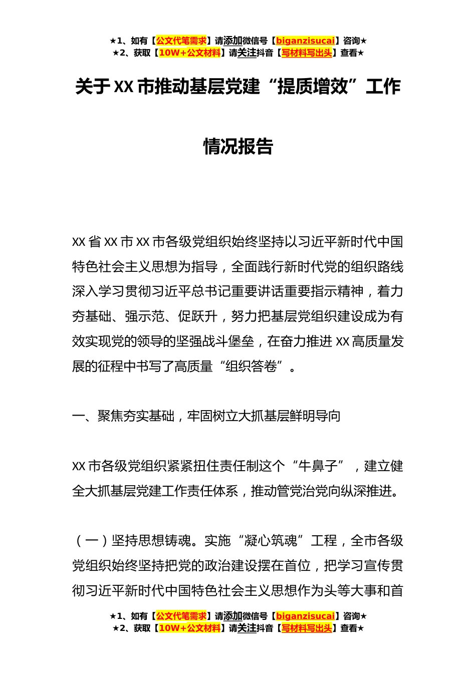★1、如有【公文代笔需求】请添加微信号【biganzisucai】咨询★★2、获取【10W+公文材料】请关注抖音【写材料写出头】查看★关于XX市推动基层党建“提质增效”工作情况报告XX省XX市XX市各级党组织始终坚持以习近平新时代中国特色社会主义思想为指导,全面践行新时代党的组织路线深入学习贯彻习近平总书记重要讲话重要指示精神,着力夯基础、强示范、促跃升,努力把基层党组织建设成为有效实现党的领导的坚强战斗堡垒,在奋力推进XX高质量发展的征程中书写了高质量“组织答卷”。一、聚焦夯实基础,牢固树立大抓基层鲜明导向XX市各级党组织紧紧扭住责任制这个“牛鼻子”,建立健全大抓基层党建工作责任体系,推动管党治党向纵深推进。(一)坚持思想铸魂。实施“凝心筑魂”工程,全市各级党组织始终坚持把党的政治...