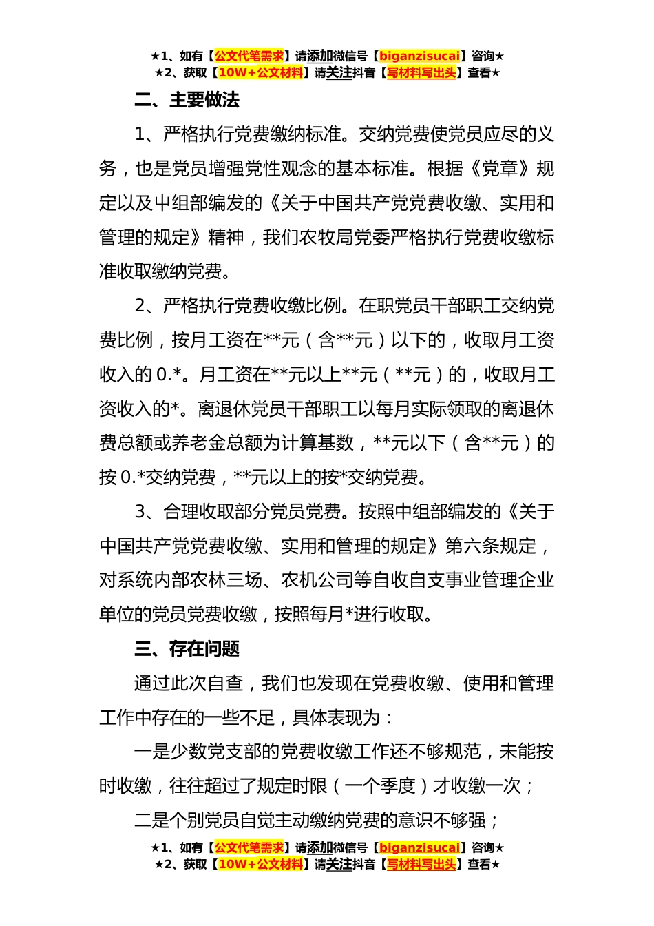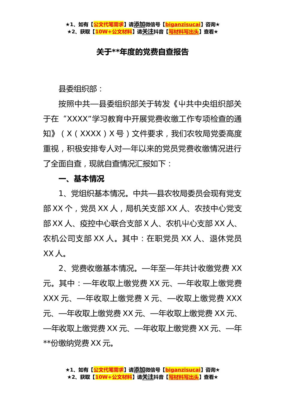 ★1、如有【公文代笔需求】请添加微信号【biganzisucai】咨询★★2、获取【10W+公文材料】请关注抖音【写材料写出头】查看★关于**年度的党费自查报告县委组织部:按照中共—县委组织部关于转发《屮共中央组织部关于在“XXXX”学习教育中开展党费收缴工作专项检查的通知》(X(XXXX)X号)文件要求,我们农牧局党委高度重视,积极安排专人对—年以来的党员党费收缴情况进行了全面自查,现就自查情况汇报如下:一、基本情况1、党组织基本情况。中共—县农牧局委员会现有党支部XX个,党员XX人,局机关支部XX人、农技中心党支部XX人、疫控中心联合支部X人、农机屮心支部XX人、农机公司支部XX人。其中:在职党员XX人、退休党员XX人。2、党费收缴基本情况。—年至—年共计收缴党费XX元。其中:—年收取上缴党费XX元、—...