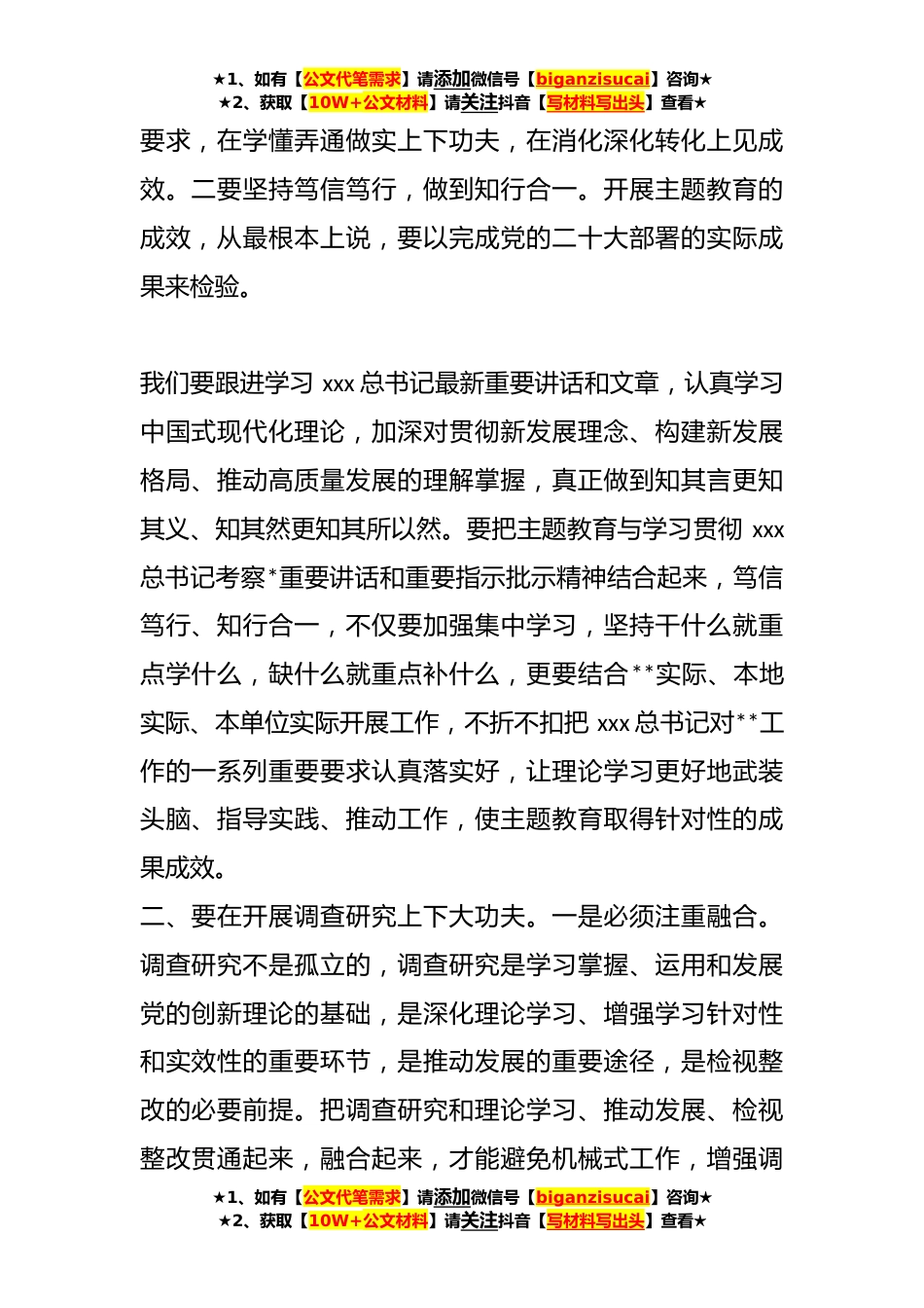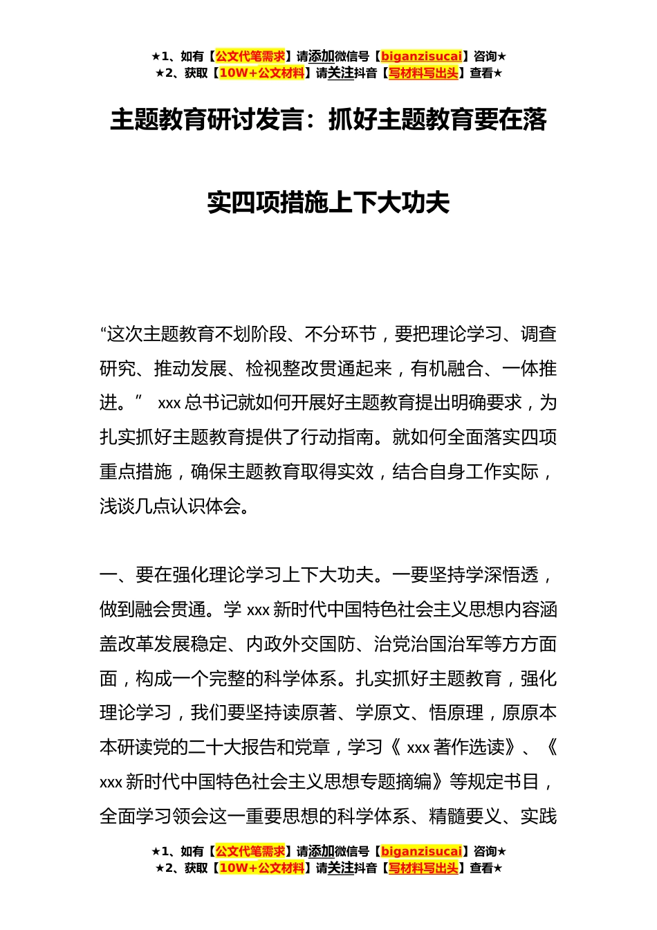 ★1、如有【公文代笔需求】请添加微信号【biganzisucai】咨询★★2、获取【10W+公文材料】请关注抖音【写材料写出头】查看★主题教育研讨发言:抓好主题教育要在落实四项措施上下大功夫“这次主题教育不划阶段、不分环节,要把理论学习、调查研究、推动发展、检视整改贯通起来,有机融合、一体推进。”xxx总书记就如何开展好主题教育提出明确要求,为扎实抓好主题教育提供了行动指南。就如何全面落实四项重点措施,确保主题教育取得实效,结合自身工作实际,浅谈几点认识体会。一、要在强化理论学习上下大功夫。一要坚持学深悟透,做到融会贯通。学xxx新时代中国特色社会主义思想内容涵盖改革发展稳定、内政外交国防、治党治国治军等方方面面,构成一个完整的科学体系。扎实抓好主题教育,强化理论学习,我们要坚...