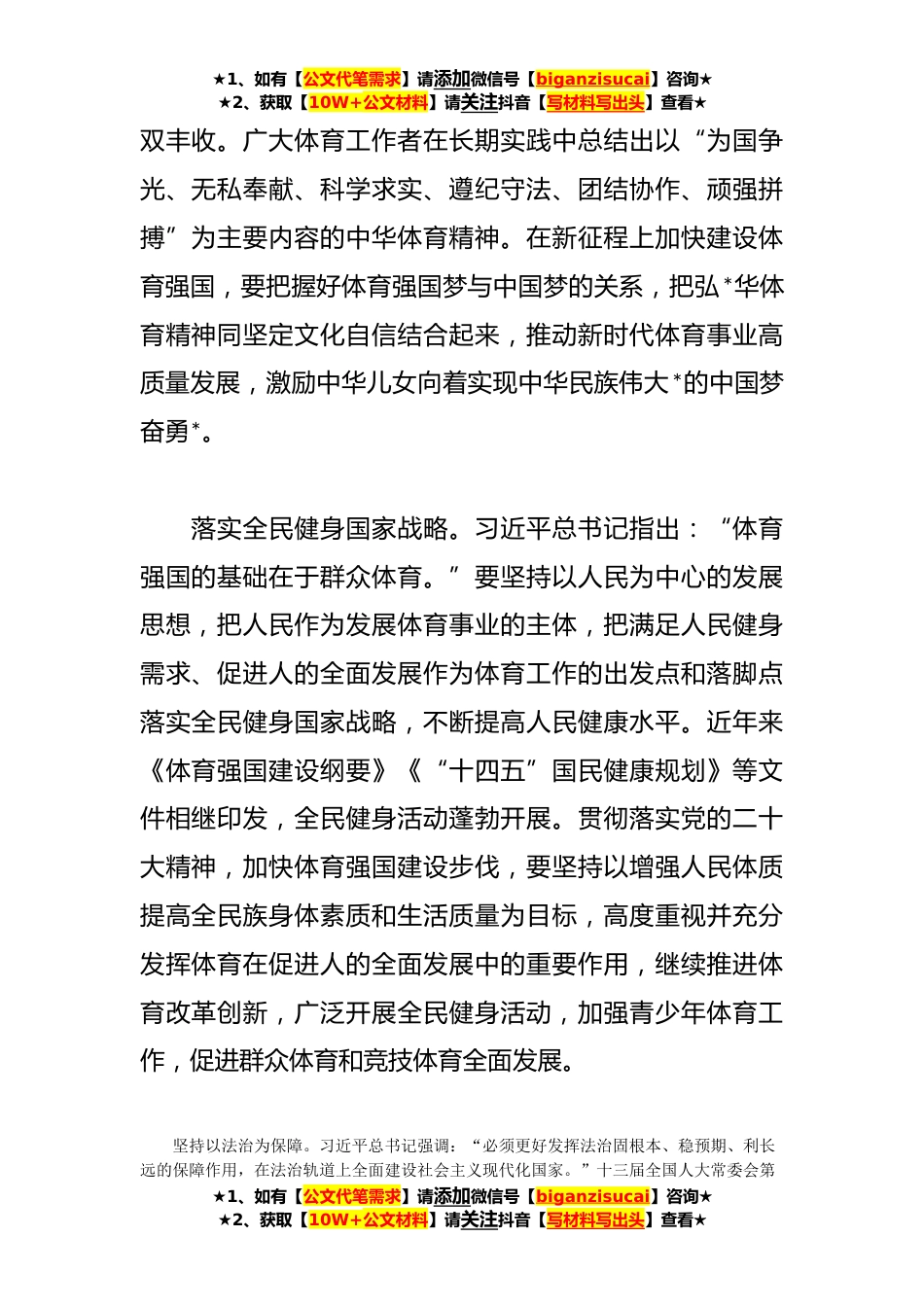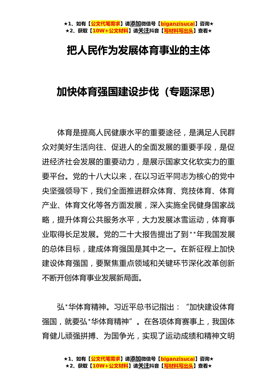 ★1、如有【公文代笔需求】请添加微信号【biganzisucai】咨询★★2、获取【10W+公文材料】请关注抖音【写材料写出头】查看★把人民作为发展体育事业的主体加快体育强国建设步伐(专题深思)体育是提高人民健康水平的重要途径,是满足人民群众对美好生活向往、促进人的全面发展的重要手段,是促进经济社会发展的重要动力,是展示国家文化软实力的重要平台。党的十八大以来,在以习近平同志为核心的党中央坚强领导下,我们全面推进群众体育、竞技体育、体育产业、体育文化等各方面发展,深入实施全民健身国家战略,提升体育公共服务水平,大力发展冰雪运动,体育事业取得长足发展。党的二十大报告提出了到**年我国发展的总体目标,建成体育强国是其中之一。在新征程上加快建设体育强国,要聚焦重点领域和关键环节深...