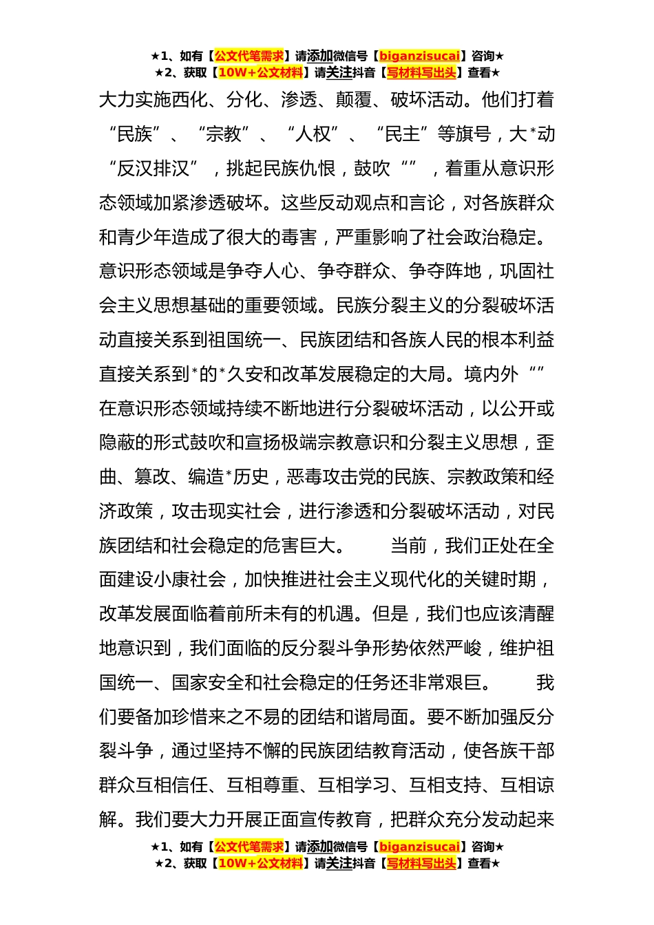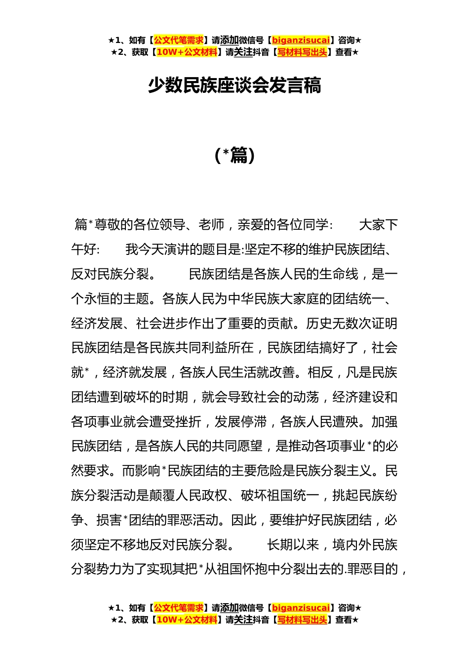 ★1、如有【公文代笔需求】请添加微信号【biganzisucai】咨询★★2、获取【10W+公文材料】请关注抖音【写材料写出头】查看★少数民族座谈会发言稿(*篇)篇*尊敬的各位领导、老师,亲爱的各位同学:大家下午好:我今天演讲的题目是:坚定不移的维护民族团结、反对民族分裂。民族团结是各族人民的生命线,是一个永恒的主题。各族人民为中华民族大家庭的团结统一、经济发展、社会进步作出了重要的贡献。历史无数次证明民族团结是各民族共同利益所在,民族团结搞好了,社会就*,经济就发展,各族人民生活就改善。相反,凡是民族团结遭到破坏的时期,就会导致社会的动荡,经济建设和各项事业就会遭受挫折,发展停滞,各族人民遭殃。加强民族团结,是各族人民的共同愿望,是推动各项事业*的必然要求。而影响*民族团结的主...