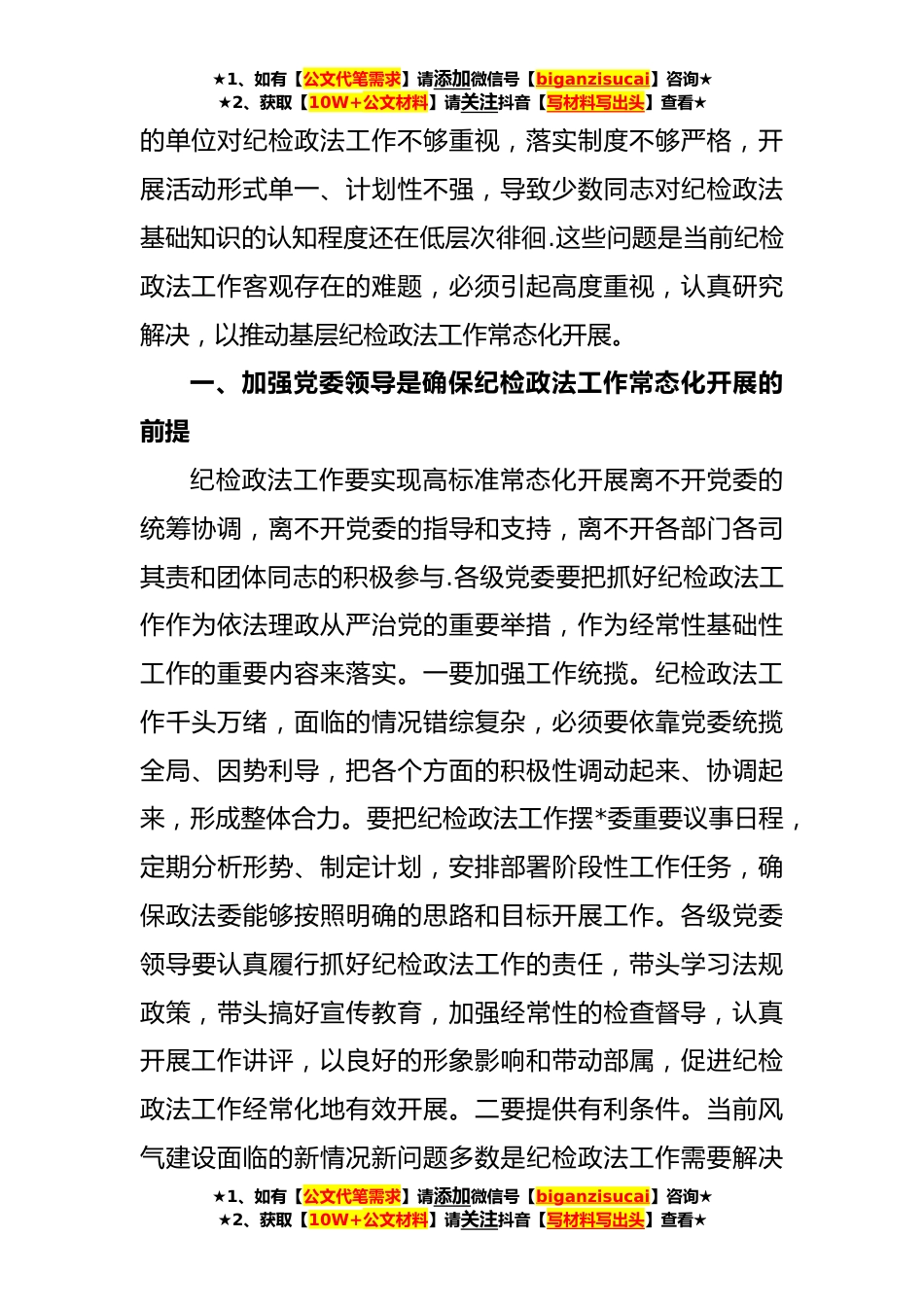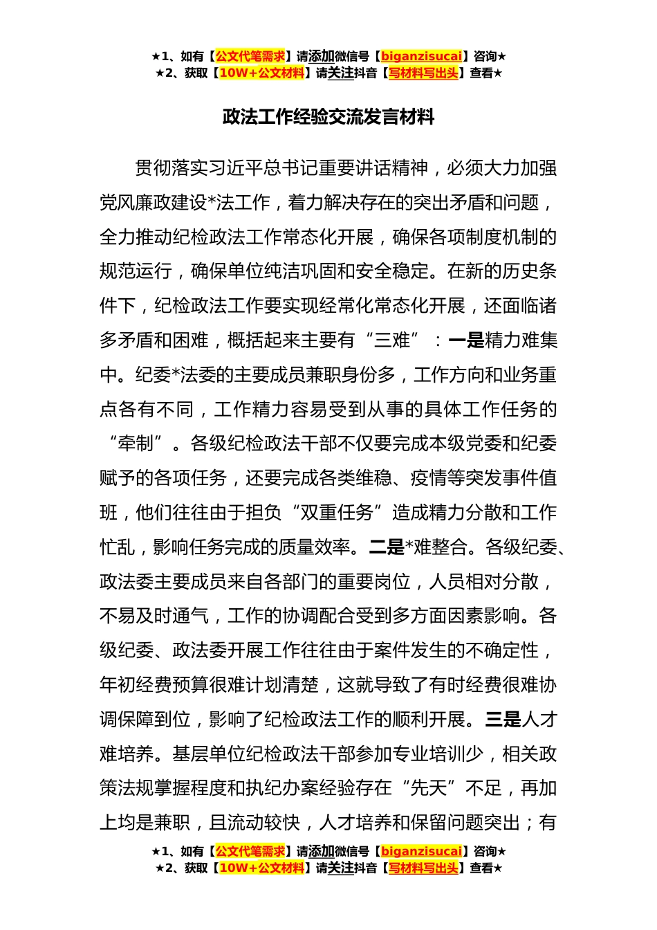 ★1、如有【公文代笔需求】请添加微信号【biganzisucai】咨询★★2、获取【10W+公文材料】请关注抖音【写材料写出头】查看★政法工作经验交流发言材料贯彻落实习近平总书记重要讲话精神,必须大力加强党风廉政建设*法工作,着力解决存在的突出矛盾和问题,全力推动纪检政法工作常态化开展,确保各项制度机制的规范运行,确保单位纯洁巩固和安全稳定。在新的历史条件下,纪检政法工作要实现经常化常态化开展,还面临诸多矛盾和困难,概括起来主要有“三难”:一是精力难集中。纪委*法委的主要成员兼职身份多,工作方向和业务重点各有不同,工作精力容易受到从事的具体工作任务的“牵制”。各级纪检政法干部不仅要完成本级党委和纪委赋予的各项任务,还要完成各类维稳、疫情等突发事件值班,他们往往由于担负“双重...