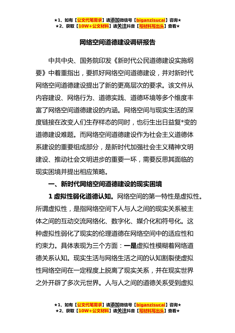 ★1、如有【公文代笔需求】请添加微信号【biganzisucai】咨询★★2、获取【10W+公文材料】请关注抖音【写材料写出头】查看★网络空间道德建设调研报告中共中央、国务院印发《新时代公民道德建设实施纲要》中着重指出,要抓好网络空间道德建设,并对新时代网络空间道德建设提出了新的更高层次的要求。该文件从内容建设、网络行为、道德实践、道德环境等多个维度丰富了网络空间道德建设的内涵。网络空间与现实生活的深度链接在改变人们生存样态的同时,也衍生出日益复*变的道德建设难题。而网络空间道德建设作为社会主义道德体系建设的重要组成部分,是新时代加强社会主义精神文明建设、推动社会文明进步的重要一环,需要反思其面临的现实困境并提出相应策略。一、新时代网络空间道德建设的现实困境1虚拟性弱化道德...