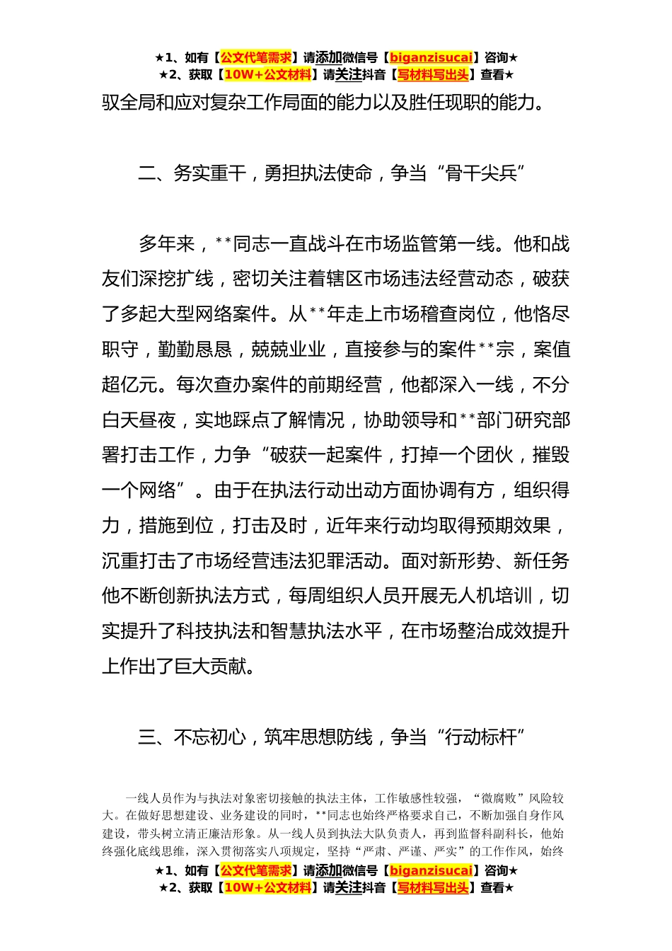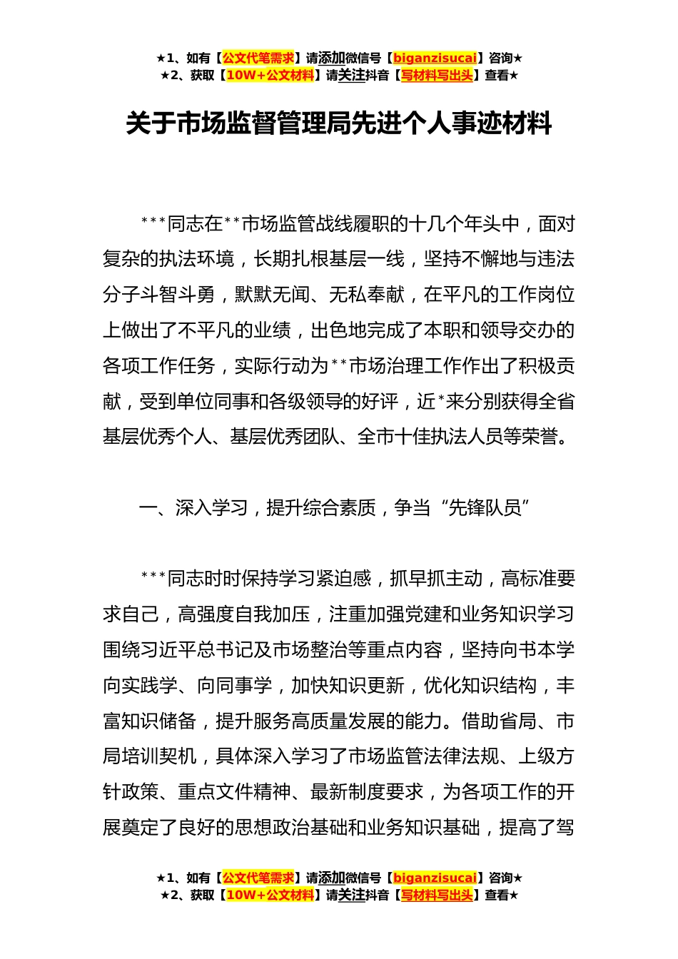 ★1、如有【公文代笔需求】请添加微信号【biganzisucai】咨询★★2、获取【10W+公文材料】请关注抖音【写材料写出头】查看★关于市场监督管理局先进个人事迹材料***同志在**市场监管战线履职的十几个年头中,面对复杂的执法环境,长期扎根基层一线,坚持不懈地与违法分子斗智斗勇,默默无闻、无私奉献,在平凡的工作岗位上做出了不平凡的业绩,出色地完成了本职和领导交办的各项工作任务,实际行动为**市场治理工作作出了积极贡献,受到单位同事和各级领导的好评,近*来分别获得全省基层优秀个人、基层优秀团队、全市十佳执法人员等荣誉。一、深入学习,提升综合素质,争当“先锋队员”***同志时时保持学习紧迫感,抓早抓主动,高标准要求自己,高强度自我加压,注重加强党建和业务知识学习围绕习近平总书记及市场...