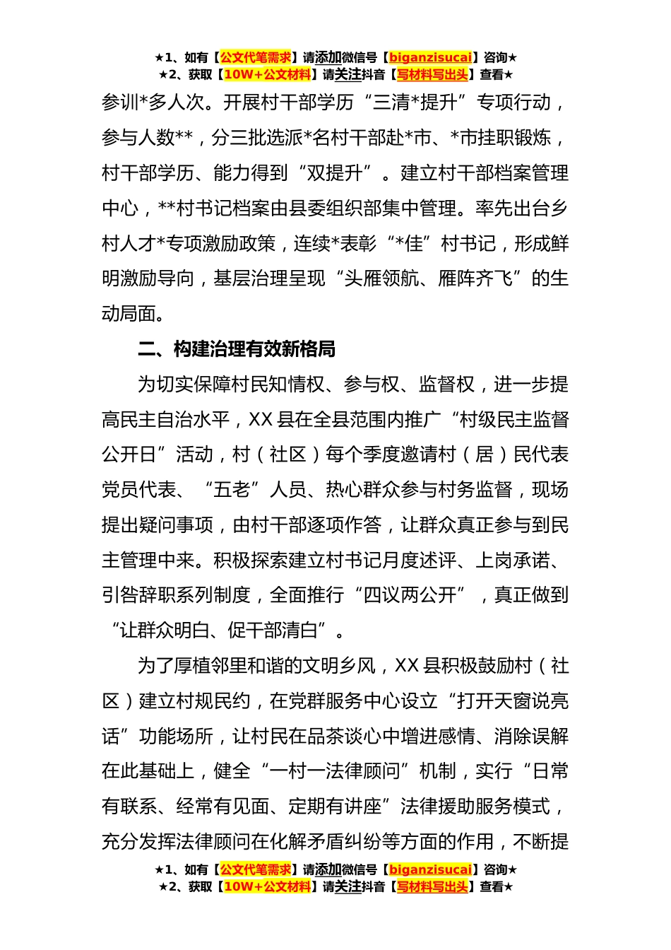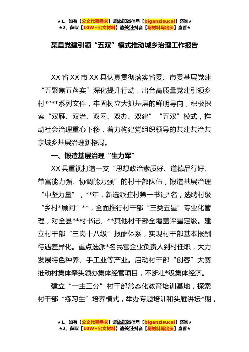 ★1、如有【公文代笔需求】请添加微信号【biganzisucai】咨询★★2、获取【10W+公文材料】请关注抖音【写材料写出头】查看★某县党建引领“五双”模式推动城乡治理工作报告XX省XX市XX县认真贯彻落实省委、市委基层党建“五聚焦五落实”深化提升行动,出台高质量党建引领乡村*“**系列文件,牢固树立大抓基层的鲜明导向,积极探索“双雁、双治、双网、双办、双建”“五双”模式,推动社会治理重心下移,着力构建党组织领导的共建共治共享城乡基层治理新格局。一、锻造基层治理“生力军”XX县重视打造一支“思想政治素质好、道德品行好、带富能力强、协调能力强”的村干部队伍,锻造基层治理“中坚力量”,**年,新选派驻村第一书记*名,选聘村级“乡村*顾问”**,全面推行村干部“三类五星”专业化管理,对全县**村...