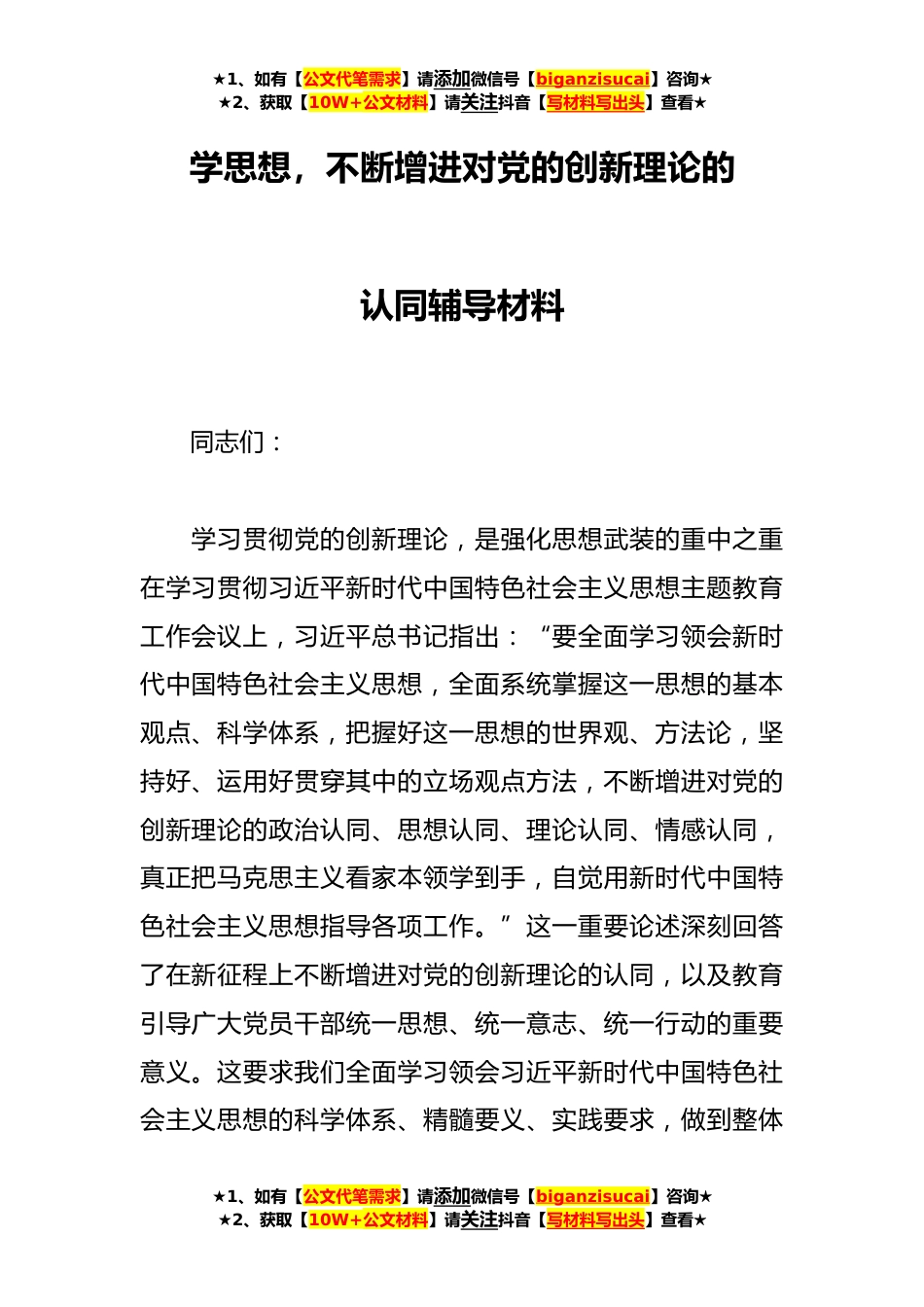 ★1、如有【公文代笔需求】请添加微信号【biganzisucai】咨询★★2、获取【10W+公文材料】请关注抖音【写材料写出头】查看★学思想,不断增进对党的创新理论的认同辅导材料同志们:学习贯彻党的创新理论,是强化思想武装的重中之重在学习贯彻习近平新时代中国特色社会主义思想主题教育工作会议上,习近平总书记指出:“要全面学习领会新时代中国特色社会主义思想,全面系统掌握这一思想的基本观点、科学体系,把握好这一思想的世界观、方法论,坚持好、运用好贯穿其中的立场观点方法,不断增进对党的创新理论的政治认同、思想认同、理论认同、情感认同,真正把马克思主义看家本领学到手,自觉用新时代中国特色社会主义思想指导各项工作。”这一重要论述深刻回答了在新征程上不断增进对党的创新理论的认同,以及教...