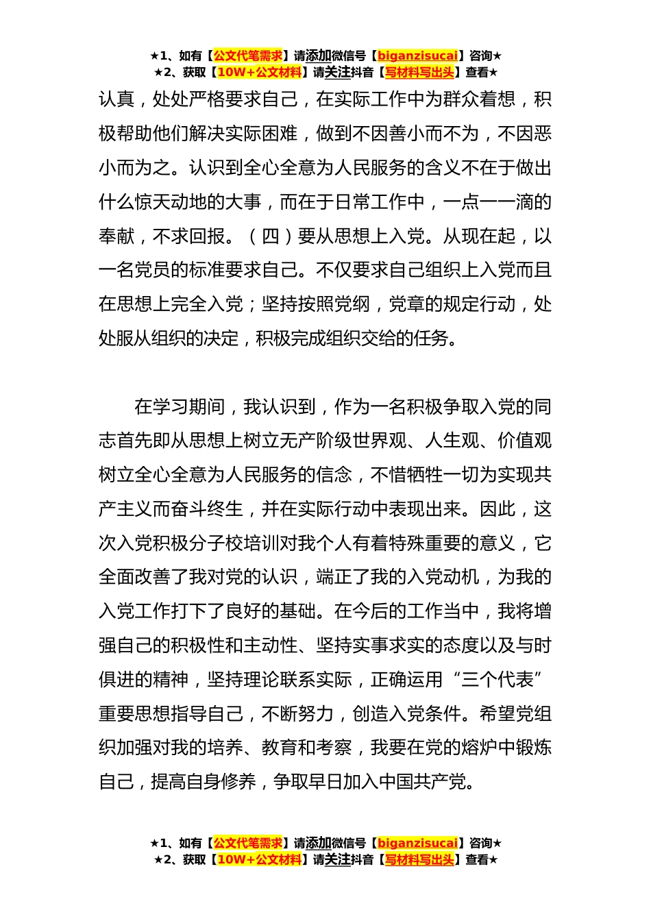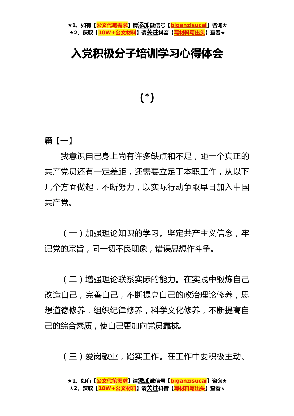 ★1、如有【公文代笔需求】请添加微信号【biganzisucai】咨询★★2、获取【10W+公文材料】请关注抖音【写材料写出头】查看★入党积极分子培训学习心得体会(*)篇【一】我意识自己身上尚有许多缺点和不足,距一个真正的共产党员还有一定差距,还需要立足于本职工作,从以下几个方面做起,不断努力,以实际行动争取早日加入中国共产党。(一)加强理论知识的学习。坚定共产主义信念,牢记党的宗旨,同一切不良现象,错误思想作斗争。(二)增强理论联系实际的能力。在实践中锻炼自己改造自己,完善自己,不断提高自己的政治理论修养,思想道德修养,组织纪律修养,科学文化修养,不断提高自己的综合素质,使自己更加向党员靠拢。(三)爱岗敬业,踏实工作。在工作中要积极主动、★1、如有【公文代笔需求】请添加微...