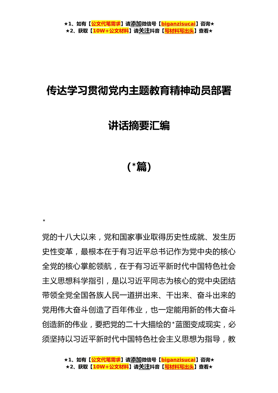 ★1、如有【公文代笔需求】请添加微信号【biganzisucai】咨询★★2、获取【10W+公文材料】请关注抖音【写材料写出头】查看★传达学习贯彻党内主题教育精神动员部署讲话摘要汇编(*篇)*党的十八大以来,党和国家事业取得历史性成就、发生历史性变革,最根本在于有习近平总书记作为党中央的核心全党的核心掌舵领航,在于有习近平新时代中国特色社会主义思想科学指引,是以习近平同志为核心的党中央团结带领全党全国各族人民一道拼出来、干出来、奋斗出来的党用伟大奋斗创造了百年伟业,也一定能用新的伟大奋斗创造新的伟业,要把党的二十大描绘的*蓝图变成现实,必须坚持以习近平新时代中国特色社会主义思想为指导,教★1、如有【公文代笔需求】请添加微信号【biganzisucai】咨询★★2、获取【10W+公文材料】请关注...