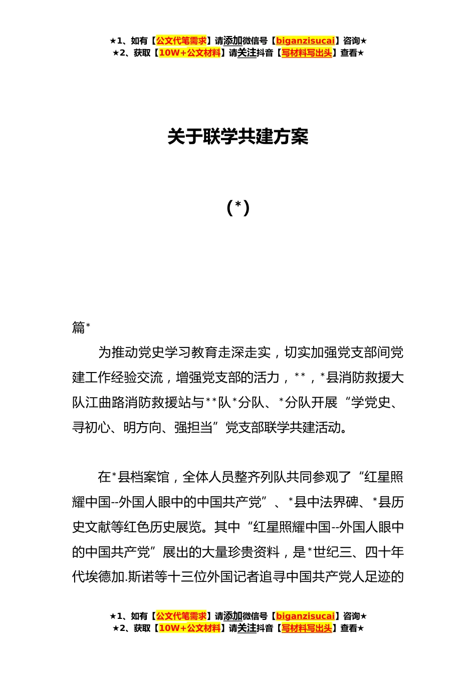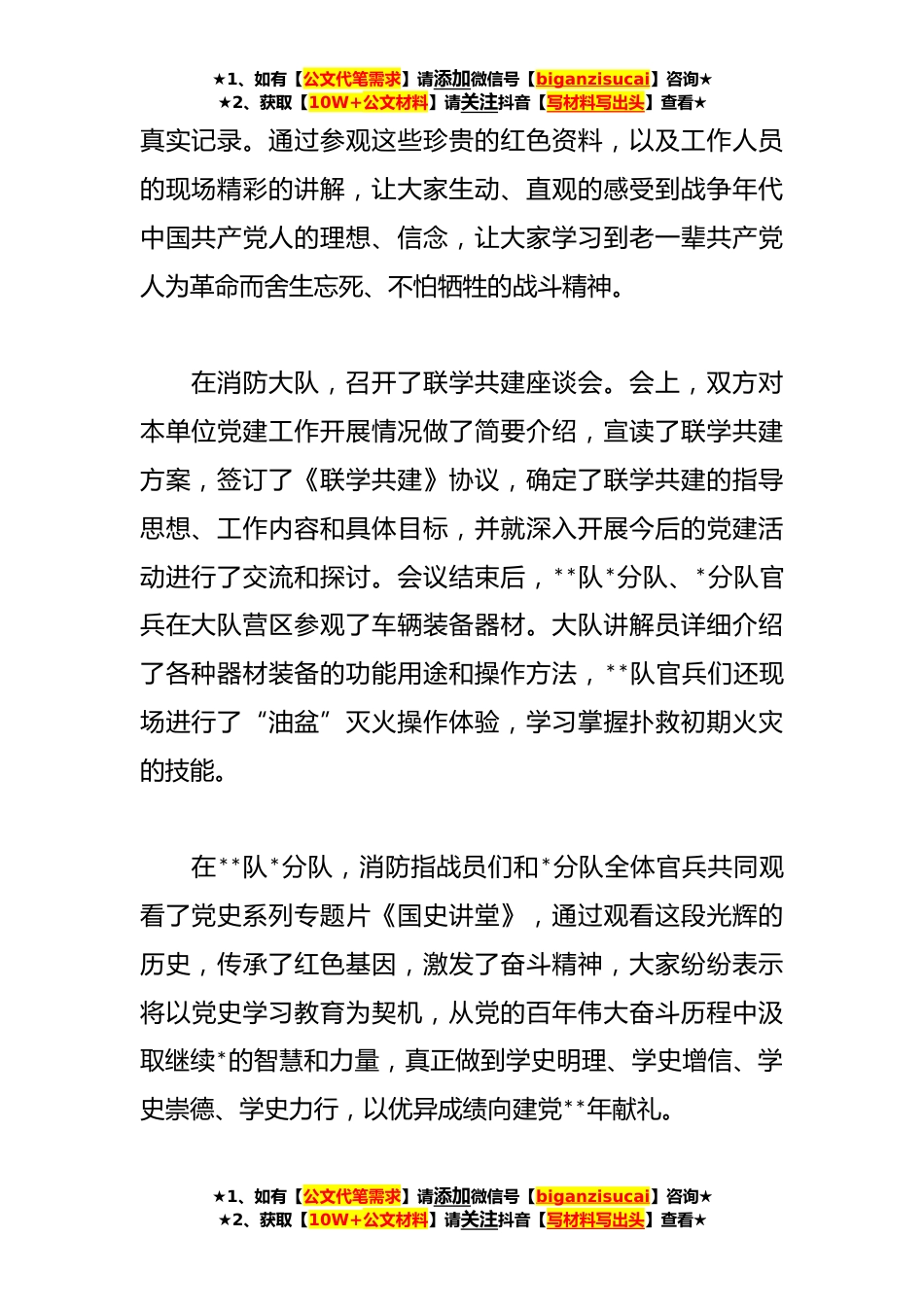 ★1、如有【公文代笔需求】请添加微信号【biganzisucai】咨询★★2、获取【10W+公文材料】请关注抖音【写材料写出头】查看★关于联学共建方案(*)篇*为推动党史学习教育走深走实,切实加强党支部间党建工作经验交流,增强党支部的活力,**,*县消防救援大队江曲路消防救援站与**队*分队、*分队开展“学党史、寻初心、明方向、强担当”党支部联学共建活动。在*县档案馆,全体人员整齐列队共同参观了“红星照耀中国--外国人眼中的中国共产党”、*县中法界碑、*县历史文献等红色历史展览。其中“红星照耀中国--外国人眼中的中国共产党”展出的大量珍贵资料,是*世纪三、四十年代埃德加.斯诺等十三位外国记者追寻中国共产党人足迹的★1、如有【公文代笔需求】请添加微信号【biganzisucai】咨询★★2、获取【10W+公文...