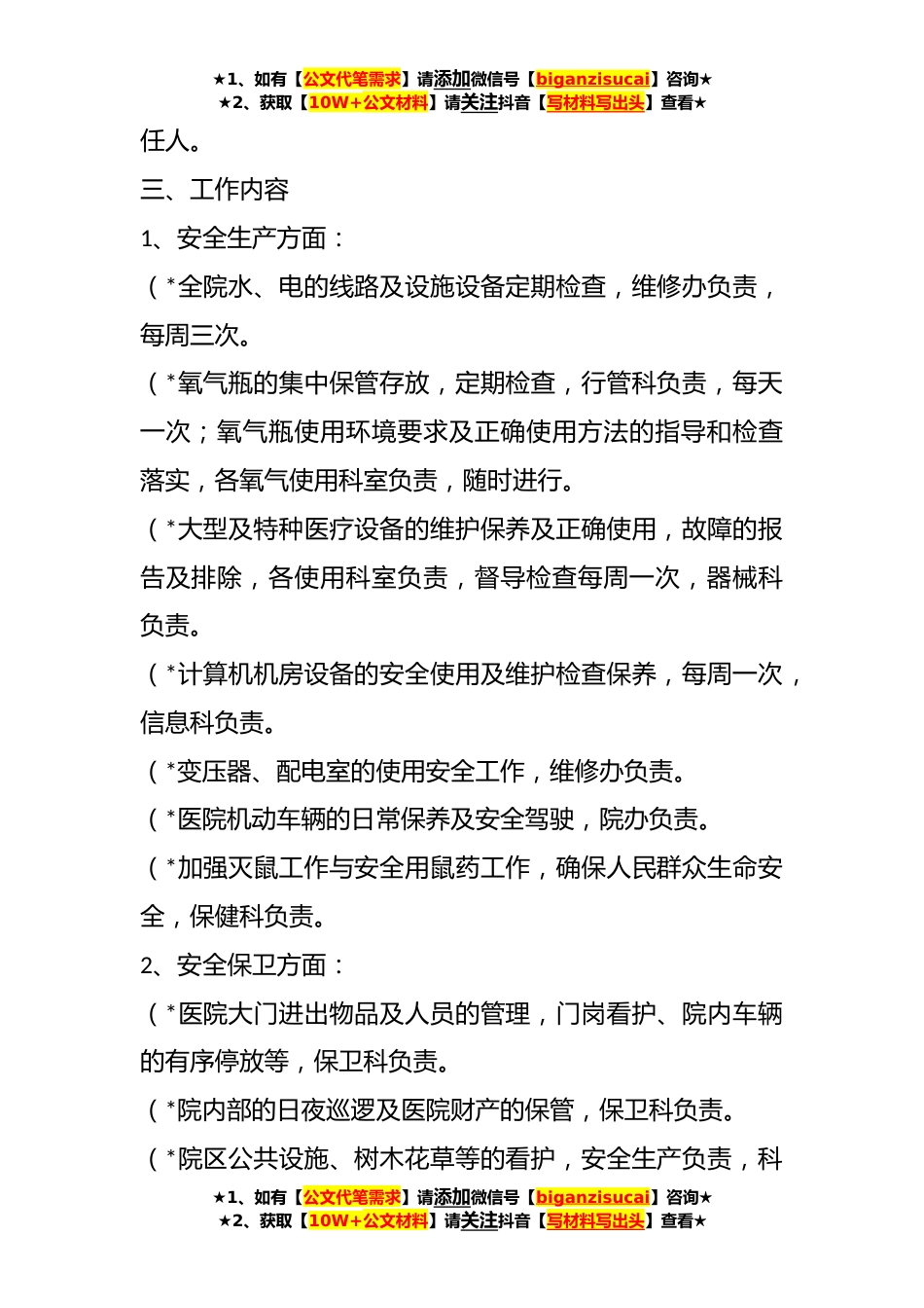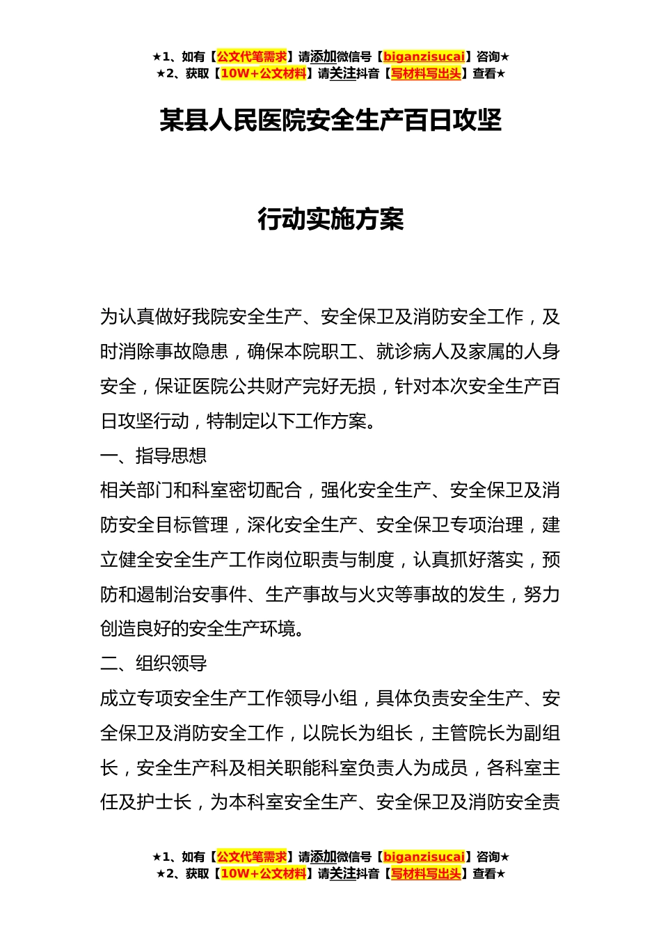 ★1、如有【公文代笔需求】请添加微信号【biganzisucai】咨询★★2、获取【10W+公文材料】请关注抖音【写材料写出头】查看★某县人民医院安全生产百日攻坚行动实施方案为认真做好我院安全生产、安全保卫及消防安全工作,及时消除事故隐患,确保本院职工、就诊病人及家属的人身安全,保证医院公共财产完好无损,针对本次安全生产百日攻坚行动,特制定以下工作方案。一、指导思想相关部门和科室密切配合,强化安全生产、安全保卫及消防安全目标管理,深化安全生产、安全保卫专项治理,建立健全安全生产工作岗位职责与制度,认真抓好落实,预防和遏制治安事件、生产事故与火灾等事故的发生,努力创造良好的安全生产环境。二、组织领导成立专项安全生产工作领导小组,具体负责安全生产、安全保卫及消防安全工作,以院...