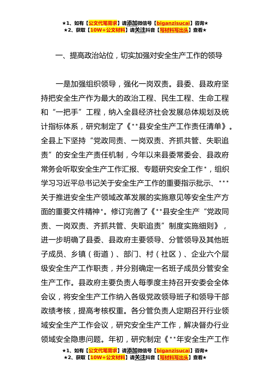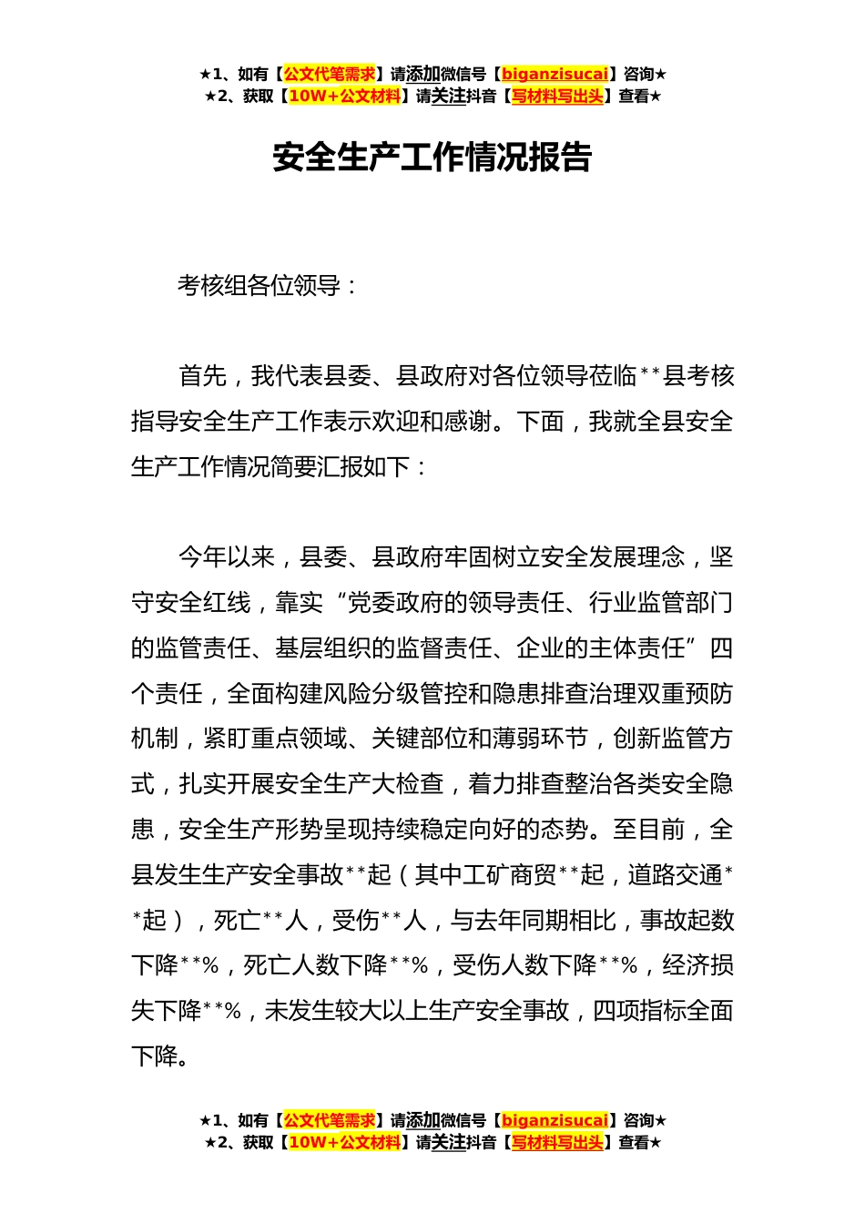★1、如有【公文代笔需求】请添加微信号【biganzisucai】咨询★★2、获取【10W+公文材料】请关注抖音【写材料写出头】查看★安全生产工作情况报告考核组各位领导:首先,我代表县委、县政府对各位领导莅临**县考核指导安全生产工作表示欢迎和感谢。下面,我就全县安全生产工作情况简要汇报如下:今年以来,县委、县政府牢固树立安全发展理念,坚守安全红线,靠实“党委政府的领导责任、行业监管部门的监管责任、基层组织的监督责任、企业的主体责任”四个责任,全面构建风险分级管控和隐患排查治理双重预防机制,紧盯重点领域、关键部位和薄弱环节,创新监管方式,扎实开展安全生产大检查,着力排查整治各类安全隐患,安全生产形势呈现持续稳定向好的态势。至目前,全县发生生产安全事故**起(其中工矿商贸**起,...