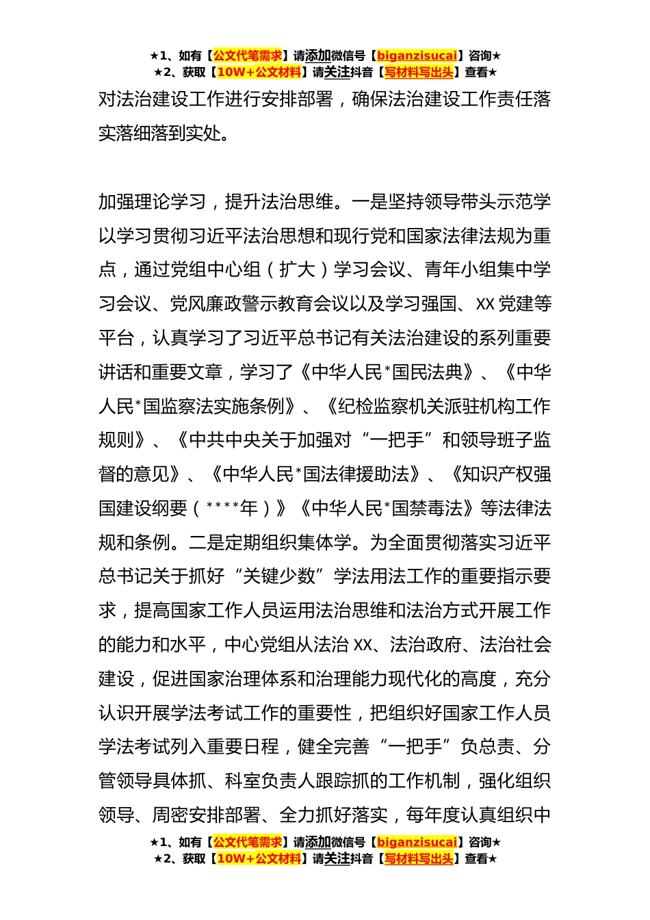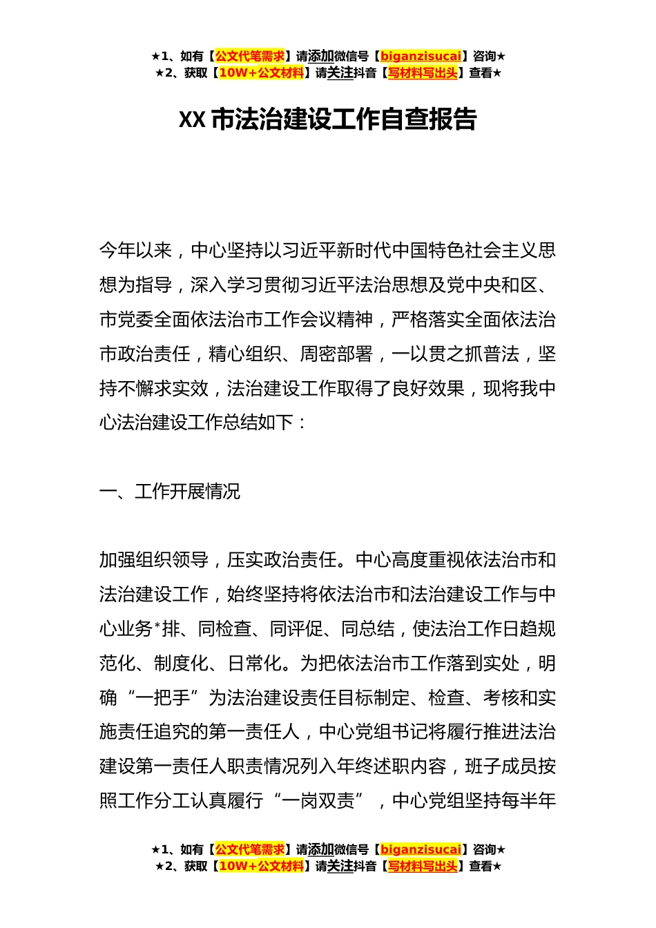 ★1、如有【公文代笔需求】请添加微信号【biganzisucai】咨询★★2、获取【10W+公文材料】请关注抖音【写材料写出头】查看★XX市法治建设工作自查报告今年以来,中心坚持以习近平新时代中国特色社会主义思想为指导,深入学习贯彻习近平法治思想及党中央和区、市党委全面依法治市工作会议精神,严格落实全面依法治市政治责任,精心组织、周密部署,一以贯之抓普法,坚持不懈求实效,法治建设工作取得了良好效果,现将我中心法治建设工作总结如下:一、工作开展情况加强组织领导,压实政治责任。中心高度重视依法治市和法治建设工作,始终坚持将依法治市和法治建设工作与中心业务*排、同检查、同评促、同总结,使法治工作日趋规范化、制度化、日常化。为把依法治市工作落到实处,明确“一把手”为法治建设责任目标制...