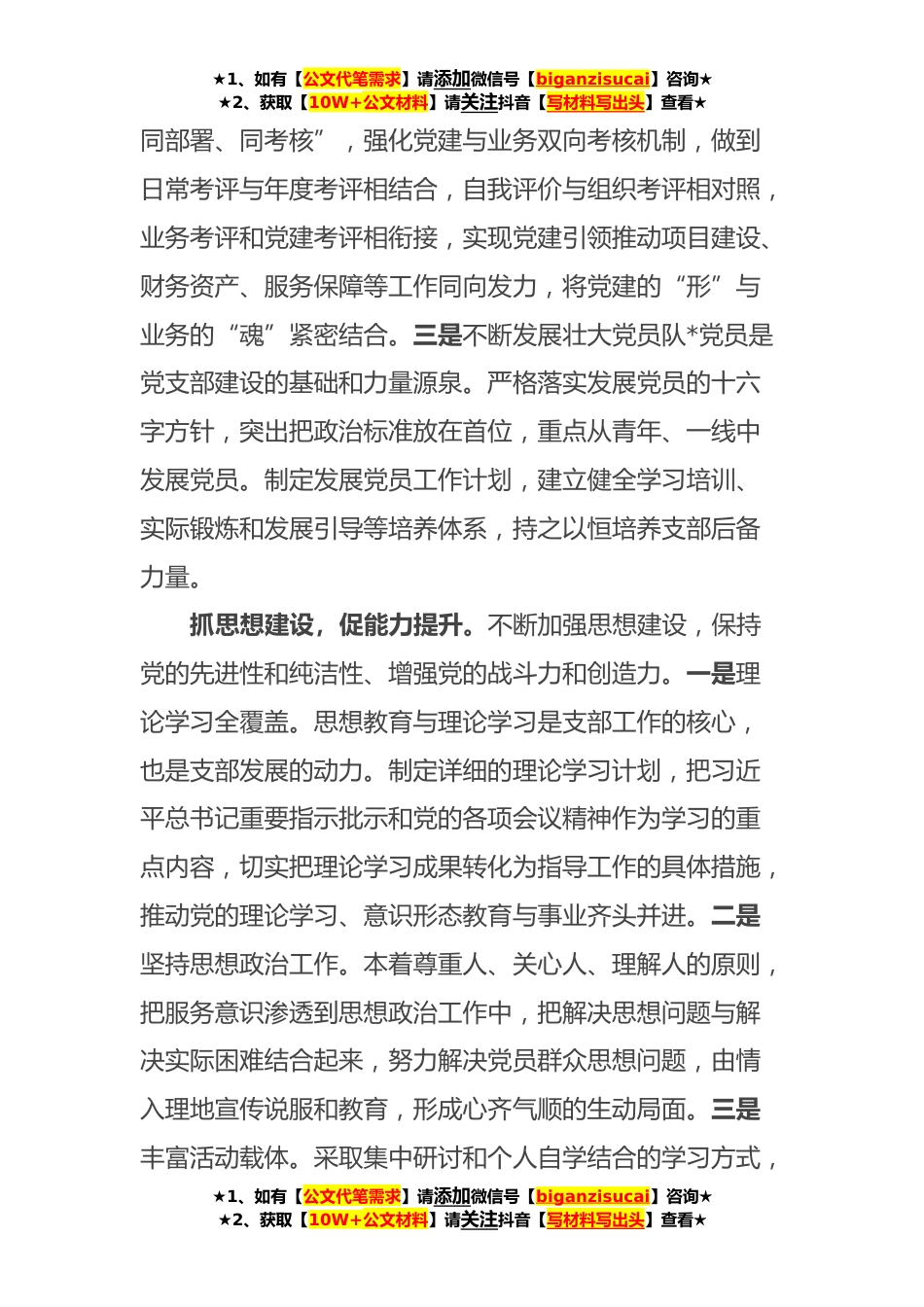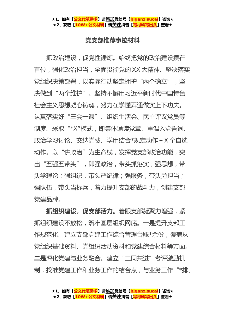 ★1、如有【公文代笔需求】请添加微信号【biganzisucai】咨询★★2、获取【10W+公文材料】请关注抖音【写材料写出头】查看★党支部推荐事迹材料抓政治建设,促党性锤炼。始终把党的政治建设摆在首位,强化政治担当,全面贯彻党的XX大精神、坚决落实党组织决策部署,以实际行动坚定拥护“两个确立”,坚决做到“两个维护”。坚持不懈用习近平新时代中国特色社会主义思想凝心铸魂,努力在学懂弄通做实上下功夫。认真落实好“三会一课”、组织生活会、民主评议党员等制度。采取“*X”模式,即集体诵读党章、重温入党誓词、政治学习讨论、交纳党费、学用结合*规定动作+X个自选动作。以“讲政治”为生命线,发挥党支部政治功能,突出“五强五带头”,即强政治,带头抓落实;强思想,带头学理论;强组织,带头严纪律;...