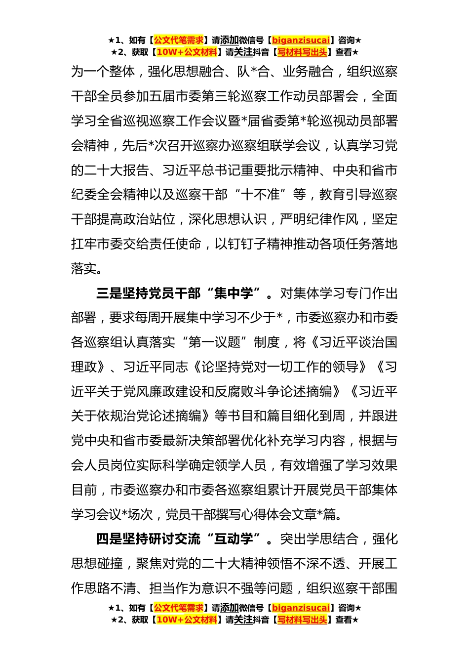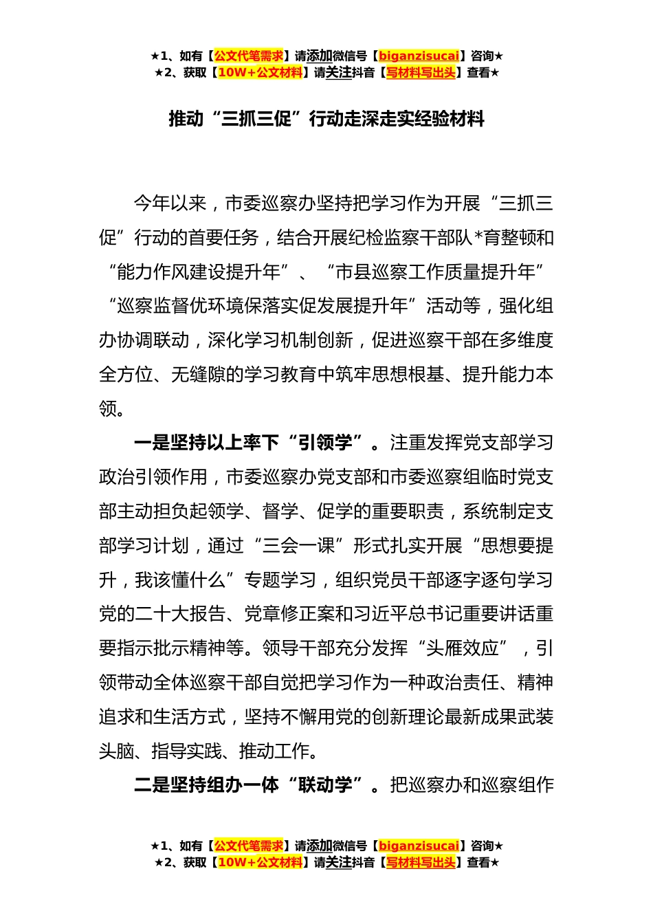 ★1、如有【公文代笔需求】请添加微信号【biganzisucai】咨询★★2、获取【10W+公文材料】请关注抖音【写材料写出头】查看★推动“三抓三促”行动走深走实经验材料今年以来,市委巡察办坚持把学习作为开展“三抓三促”行动的首要任务,结合开展纪检监察干部队*育整顿和“能力作风建设提升年”、“市县巡察工作质量提升年”“巡察监督优环境保落实促发展提升年”活动等,强化组办协调联动,深化学习机制创新,促进巡察干部在多维度全方位、无缝隙的学习教育中筑牢思想根基、提升能力本领。一是坚持以上率下“引领学”。注重发挥党支部学习政治引领作用,市委巡察办党支部和市委巡察组临时党支部主动担负起领学、督学、促学的重要职责,系统制定支部学习计划,通过“三会一课”形式扎实开展“思想要提升,我该懂什么...