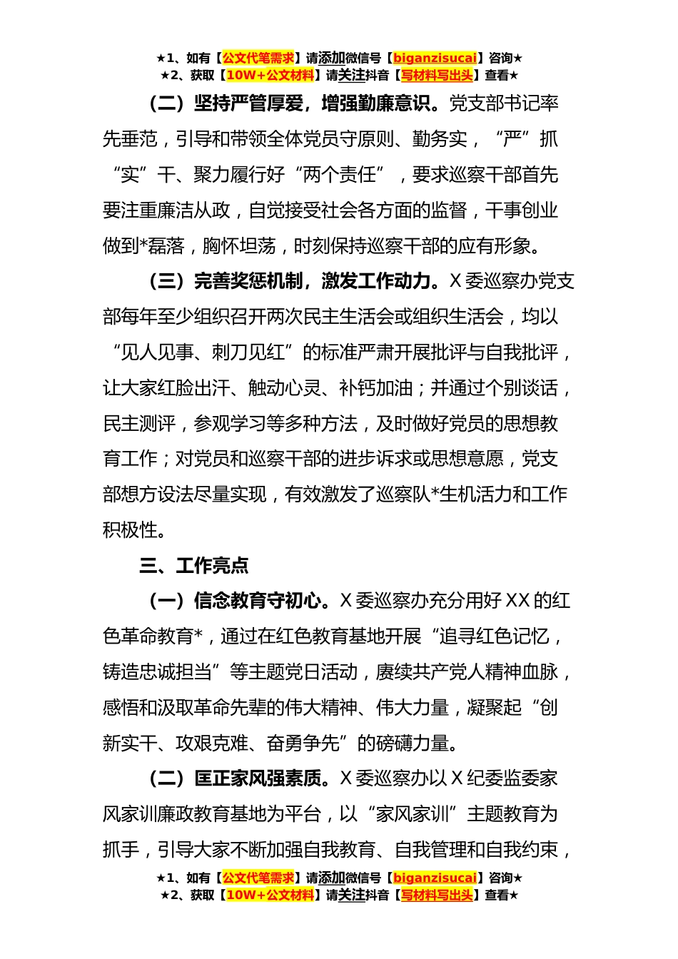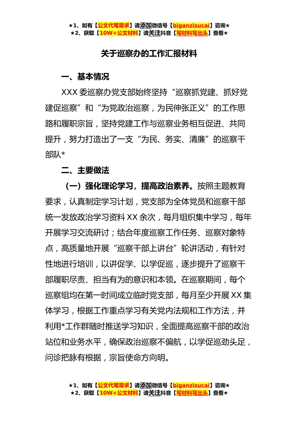 ★1、如有【公文代笔需求】请添加微信号【biganzisucai】咨询★★2、获取【10W+公文材料】请关注抖音【写材料写出头】查看★关于巡察办的工作汇报材料一、基本情况XXX委巡察办党支部始终坚持“巡察抓党建、抓好党建促巡察”和“为党政治巡察,为民伸张正义”的工作思路和履职宗旨,坚持党建工作与巡察业务相互促进、共同提升,努力打造出了一支“为民、务实、清廉”的巡察干部队*二、主要做法(一)强化理论学习,提高政治素养。按照主题教育要求,认真制定学习计划,党支部为全体党员和巡察干部统一发放政治学习资料XX余次,每月组织集中学习,每年开展学习交流研讨;结合年度巡察工作任务、巡察对象特点,高质量地开展“巡察干部上讲台”轮讲活动,有针对性地进行培训,以讲促学、以学促巡,逐步提升了巡察干部...