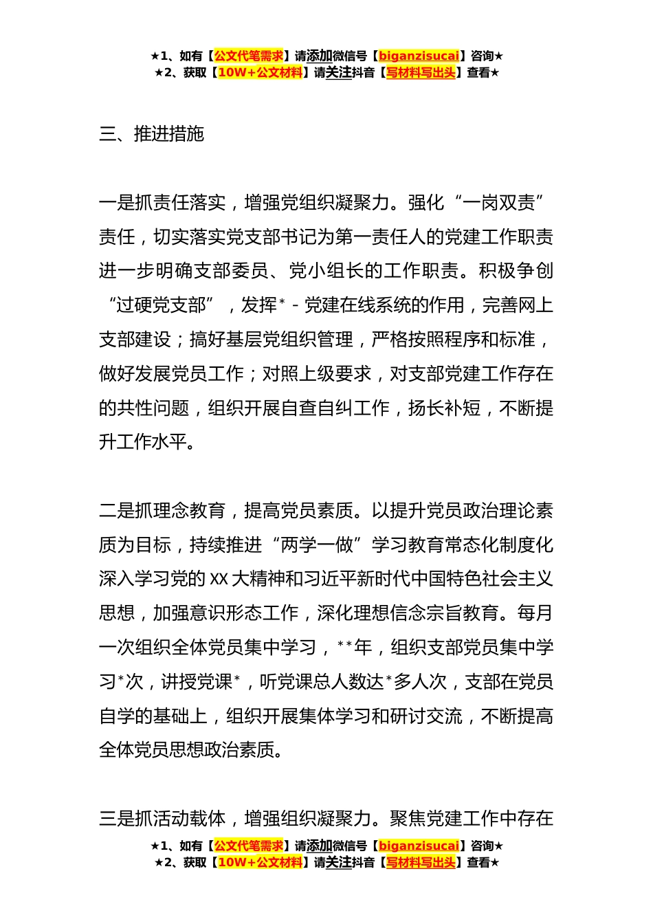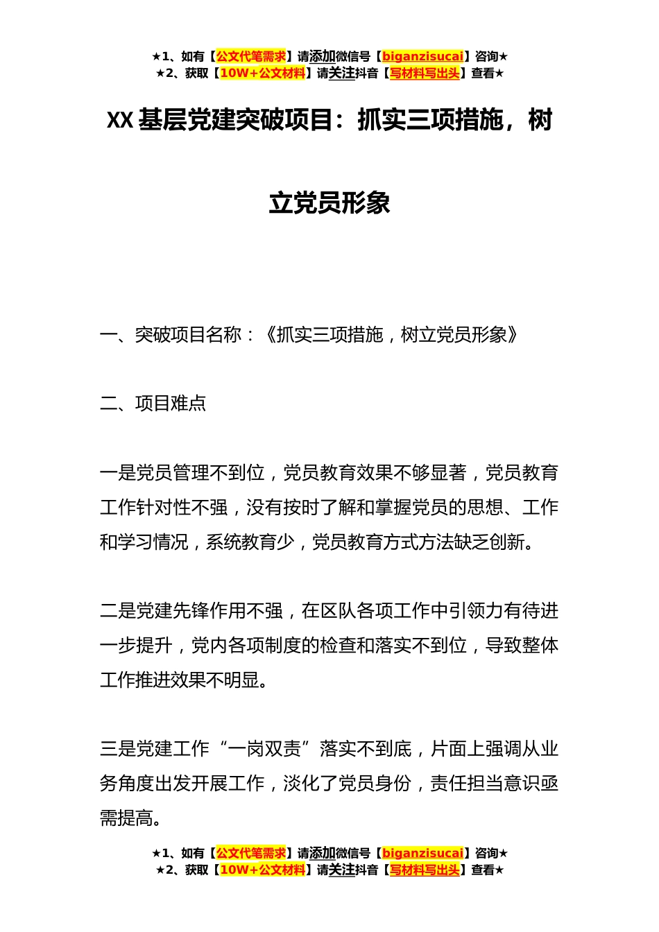 ★1、如有【公文代笔需求】请添加微信号【biganzisucai】咨询★★2、获取【10W+公文材料】请关注抖音【写材料写出头】查看★XX基层党建突破项目:抓实三项措施,树立党员形象一、突破项目名称:《抓实三项措施,树立党员形象》二、项目难点一是党员管理不到位,党员教育效果不够显著,党员教育工作针对性不强,没有按时了解和掌握党员的思想、工作和学习情况,系统教育少,党员教育方式方法缺乏创新。二是党建先锋作用不强,在区队各项工作中引领力有待进一步提升,党内各项制度的检查和落实不到位,导致整体工作推进效果不明显。三是党建工作“一岗双责”落实不到底,片面上强调从业务角度出发开展工作,淡化了党员身份,责任担当意识亟需提高。★1、如有【公文代笔需求】请添加微信号【biganzisucai】咨询★★2...