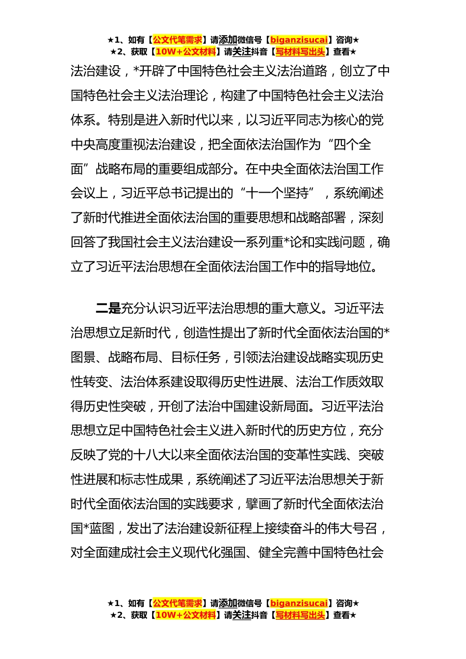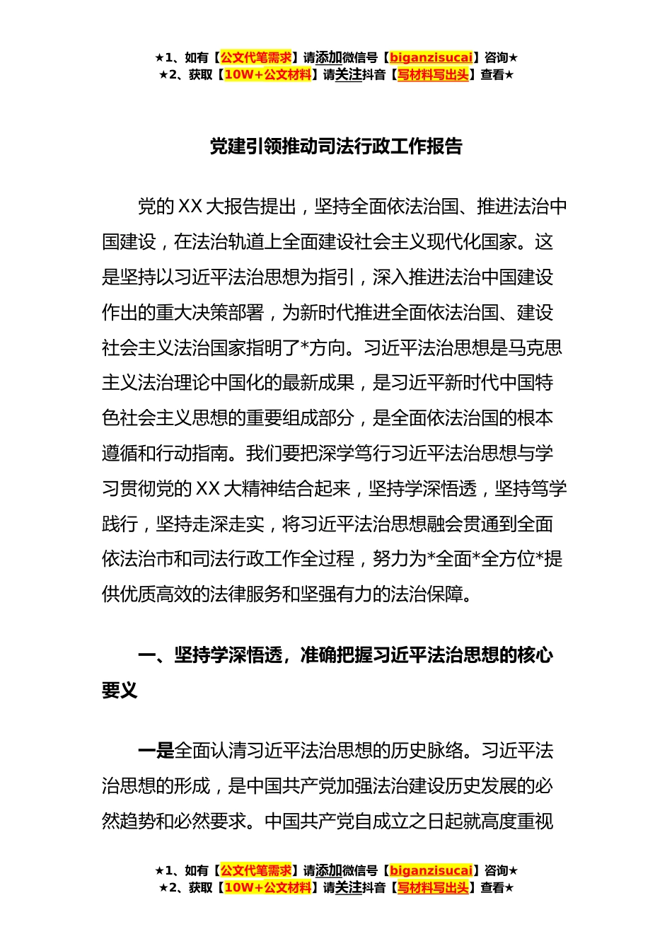 ★1、如有【公文代笔需求】请添加微信号【biganzisucai】咨询★★2、获取【10W+公文材料】请关注抖音【写材料写出头】查看★党建引领推动司法行政工作报告党的XX大报告提出,坚持全面依法治国、推进法治中国建设,在法治轨道上全面建设社会主义现代化国家。这是坚持以习近平法治思想为指引,深入推进法治中国建设作出的重大决策部署,为新时代推进全面依法治国、建设社会主义法治国家指明了*方向。习近平法治思想是马克思主义法治理论中国化的最新成果,是习近平新时代中国特色社会主义思想的重要组成部分,是全面依法治国的根本遵循和行动指南。我们要把深学笃行习近平法治思想与学习贯彻党的XX大精神结合起来,坚持学深悟透,坚持笃学践行,坚持走深走实,将习近平法治思想融会贯通到全面依法治市和司法行政工作...