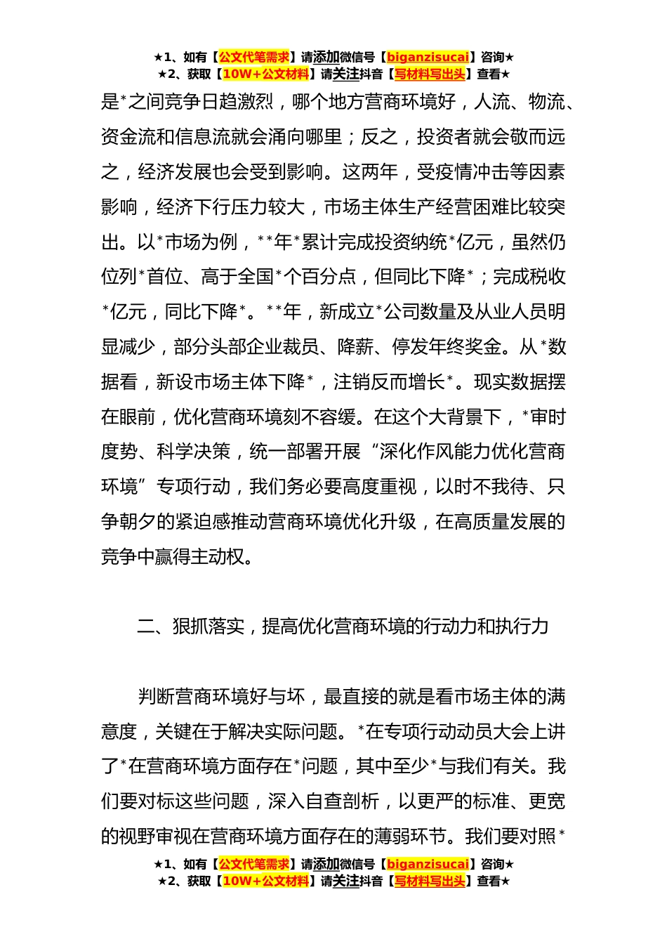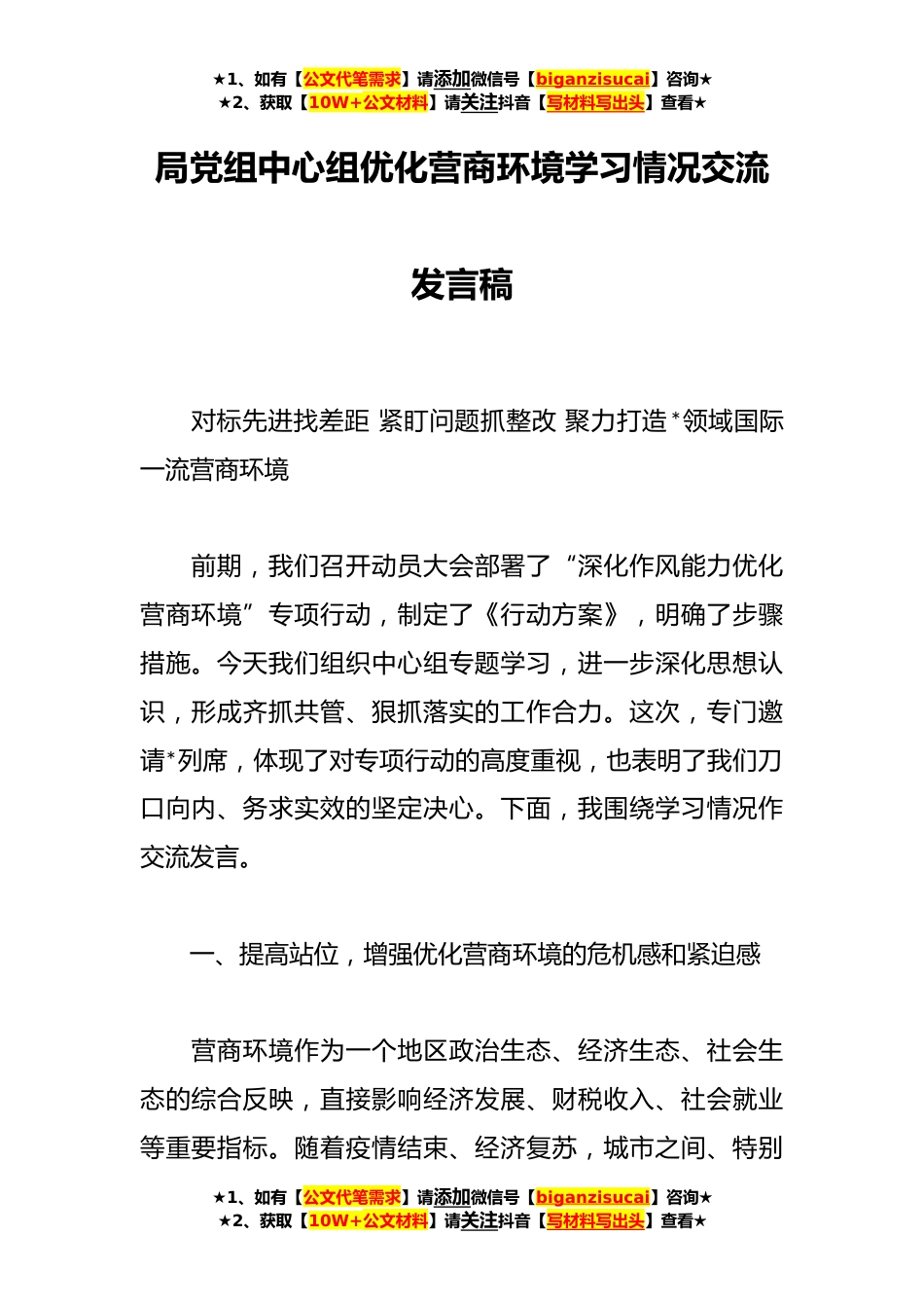 ★1、如有【公文代笔需求】请添加微信号【biganzisucai】咨询★★2、获取【10W+公文材料】请关注抖音【写材料写出头】查看★局党组中心组优化营商环境学习情况交流发言稿对标先进找差距紧盯问题抓整改聚力打造*领域国际一流营商环境前期,我们召开动员大会部署了“深化作风能力优化营商环境”专项行动,制定了《行动方案》,明确了步骤措施。今天我们组织中心组专题学习,进一步深化思想认识,形成齐抓共管、狠抓落实的工作合力。这次,专门邀请*列席,体现了对专项行动的高度重视,也表明了我们刀口向内、务求实效的坚定决心。下面,我围绕学习情况作交流发言。一、提高站位,增强优化营商环境的危机感和紧迫感营商环境作为一个地区政治生态、经济生态、社会生态的综合反映,直接影响经济发展、财税收入、社会就...