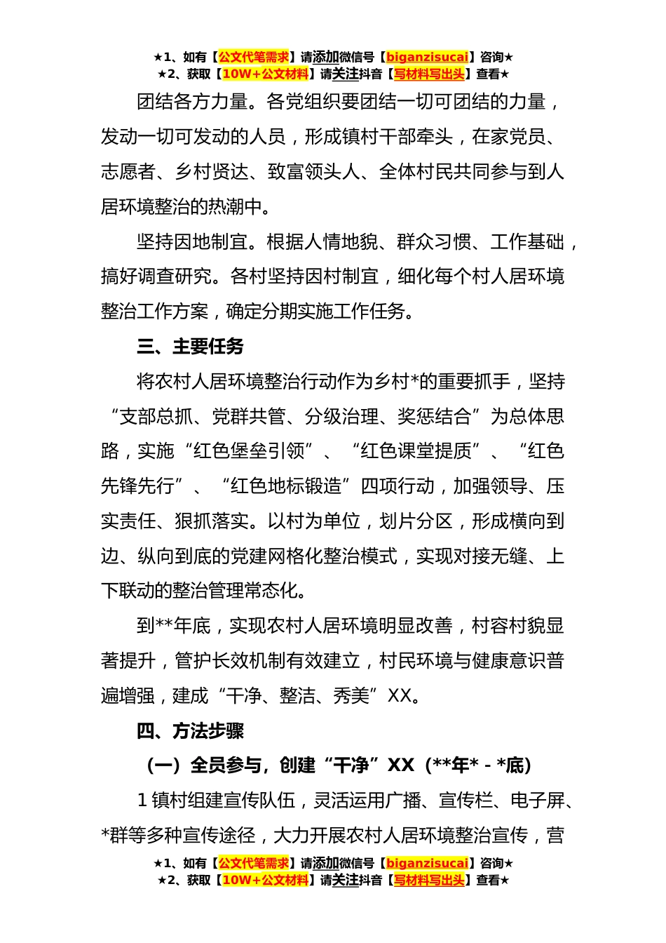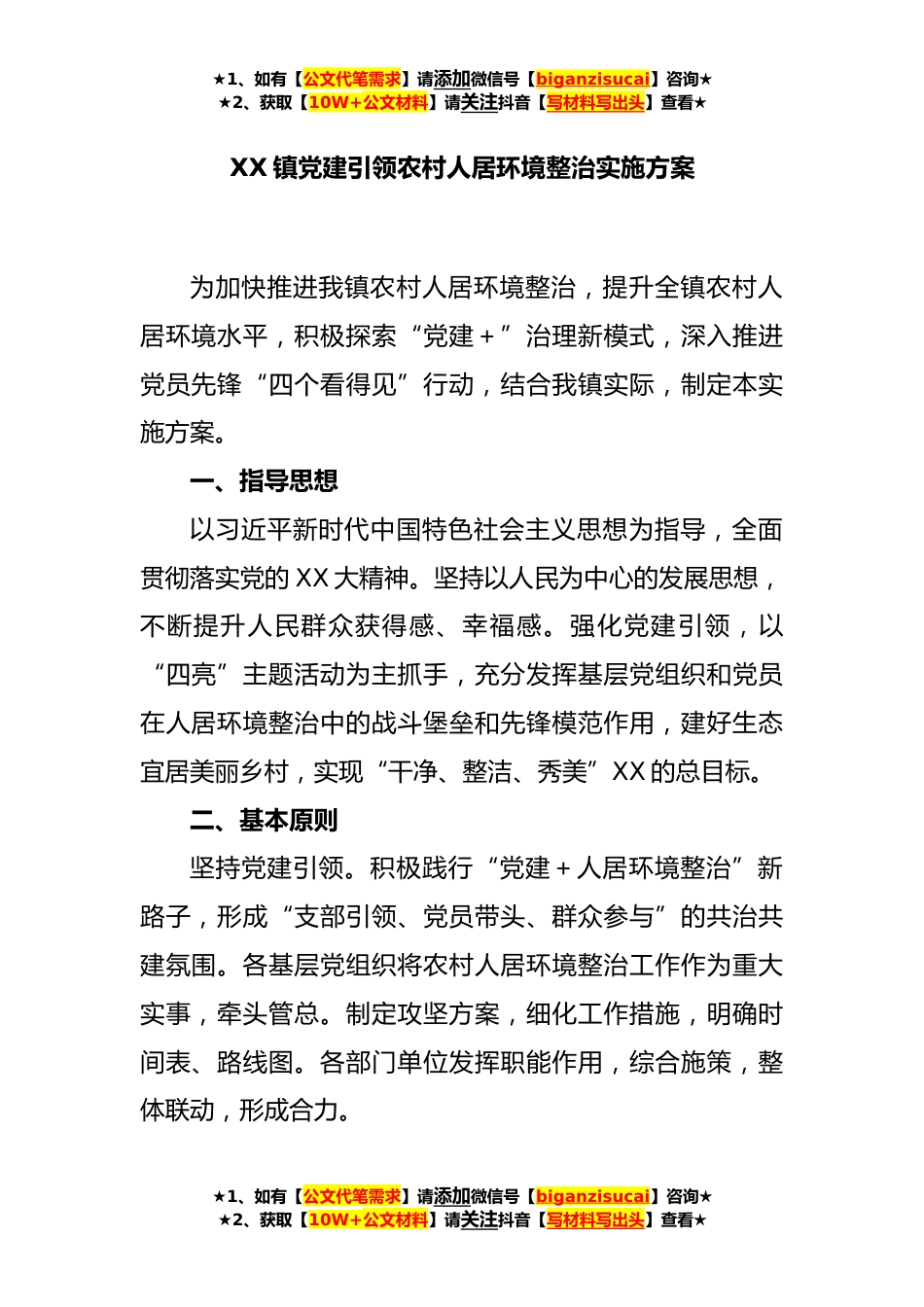 ★1、如有【公文代笔需求】请添加微信号【biganzisucai】咨询★★2、获取【10W+公文材料】请关注抖音【写材料写出头】查看★XX镇党建引领农村人居环境整治实施方案为加快推进我镇农村人居环境整治,提升全镇农村人居环境水平,积极探索“党建+”治理新模式,深入推进党员先锋“四个看得见”行动,结合我镇实际,制定本实施方案。一、指导思想以习近平新时代中国特色社会主义思想为指导,全面贯彻落实党的XX大精神。坚持以人民为中心的发展思想,不断提升人民群众获得感、幸福感。强化党建引领,以“四亮”主题活动为主抓手,充分发挥基层党组织和党员在人居环境整治中的战斗堡垒和先锋模范作用,建好生态宜居美丽乡村,实现“干净、整洁、秀美”XX的总目标。二、基本原则坚持党建引领。积极践行“党建+人居环境...