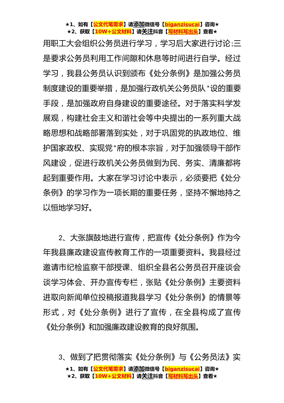 ★1、如有【公文代笔需求】请添加微信号【biganzisucai】咨询★★2、获取【10W+公文材料】请关注抖音【写材料写出头】查看★党员处分期思想汇报(*)篇*敬爱的院领导:为认真贯彻落实《行政机关公务员处分条例》精神,我县公务员管理部门高度重视,精心组织,运用多种形式认真抓好《条例》的学习宣传,增强公务员纪律意识,采取有力措施抓好贯彻落实,切实提高公务员队*理水平,进一步树立机关公务员队*良好形象。现将我县学习贯彻《条例》情景汇报如下:一、《处分条例》的学习、宣传和培训情景1、认真组织学习,充分认识颁布实施《处分条例》的重大意义。我县为机关全体公务员征订了学习教材,做到了机关公务员人手一册学习教材。一是将《处分条例》纳入了局党组理论学习中心组的学习计划进行了学习;二是利★1、...